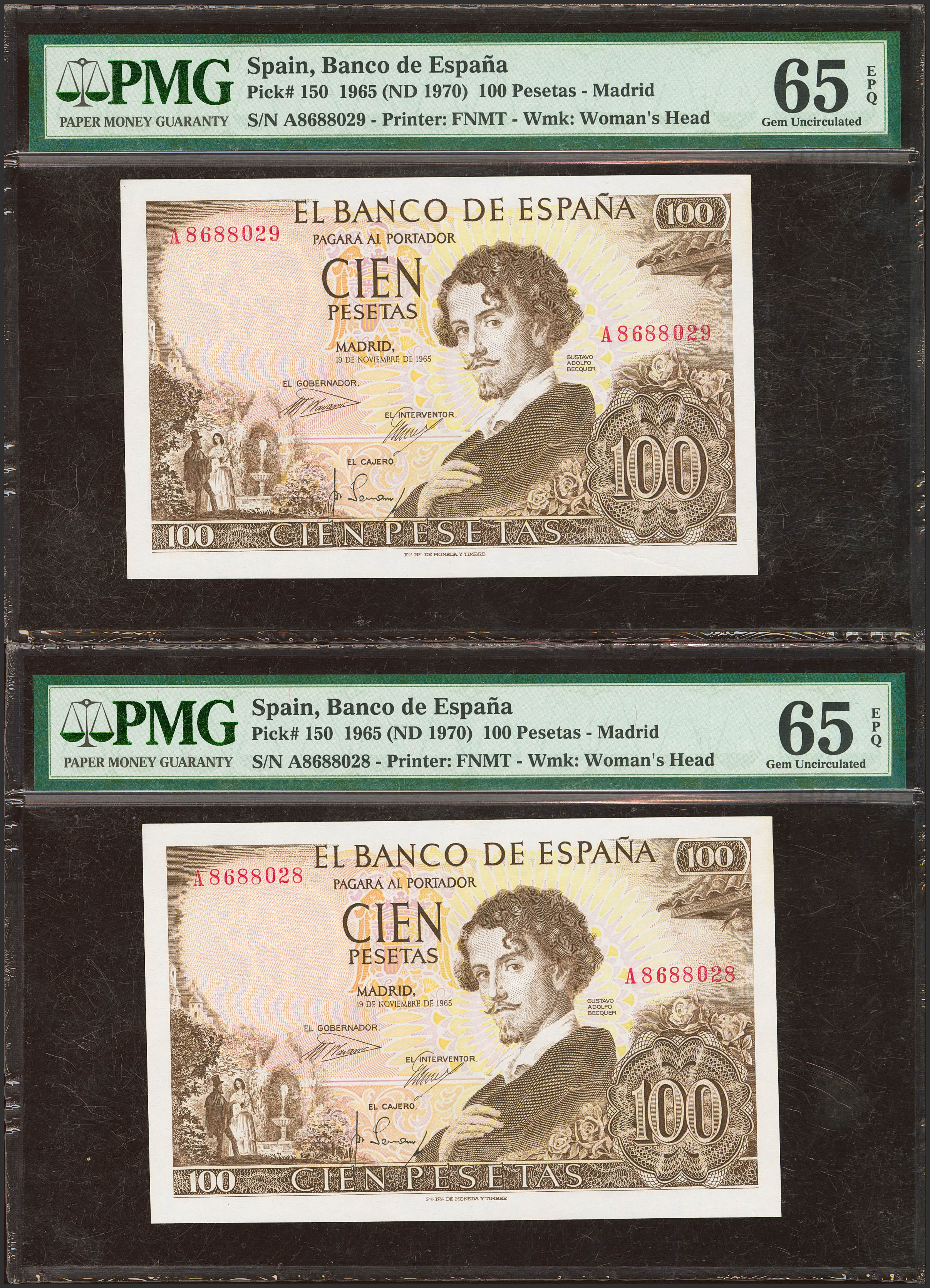 100 Pesetas. November 19, 1965. Correlative couple. Series A. (Edifil 2023: 470a, Pick: 150). Original sizing. PMG66EPQ packages, both.