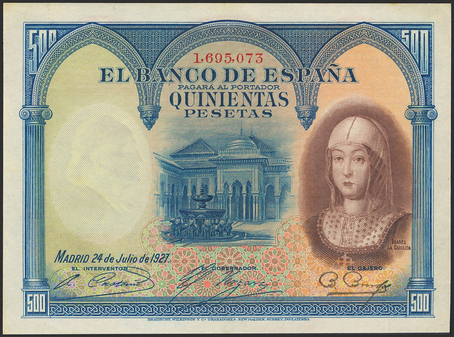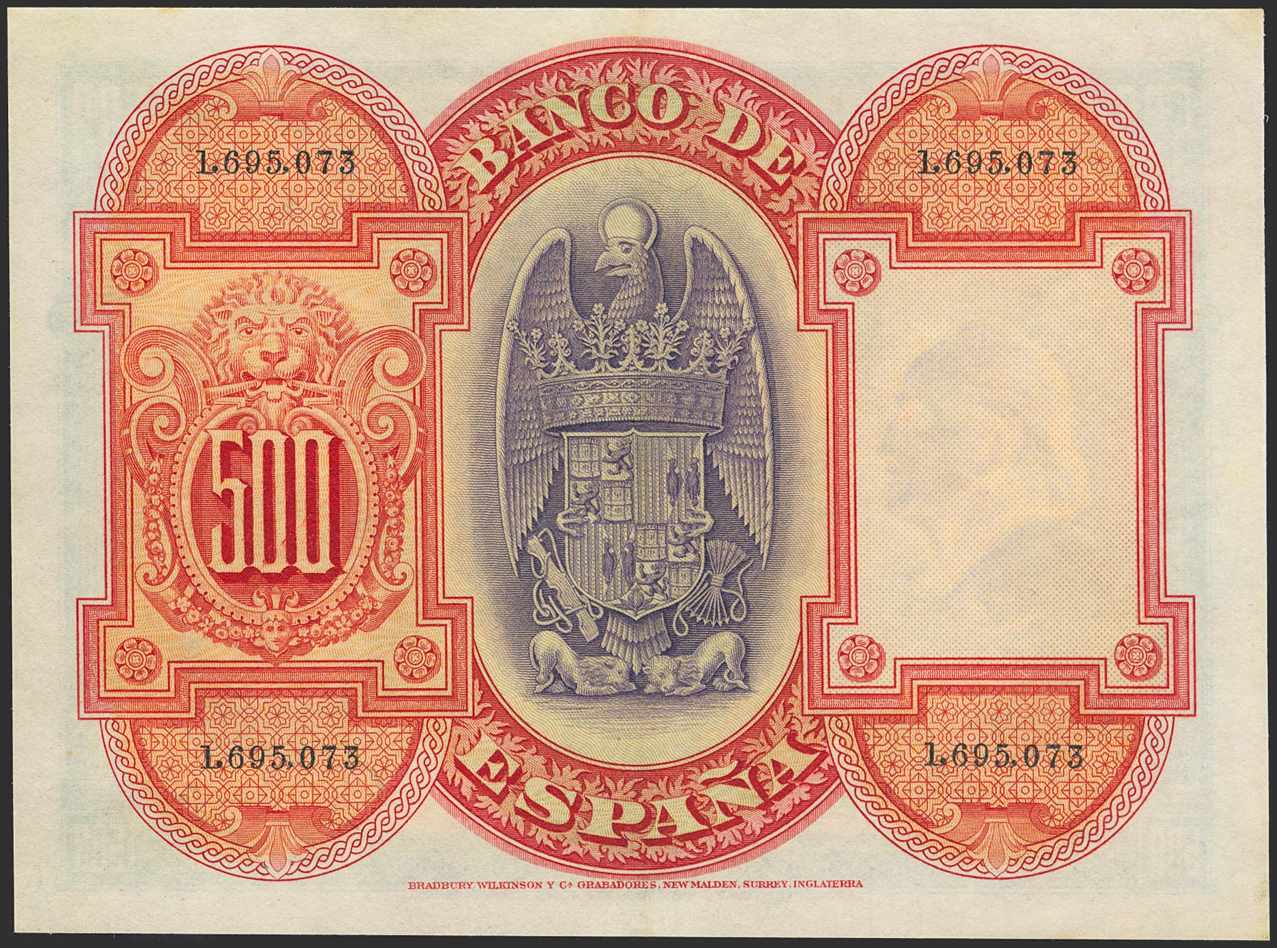 500 Pesetas. July 24, 1927. Without series and numbering after 1602000. (Edifil 2021: 352). It retains part of the original finish. Extremely Fine.