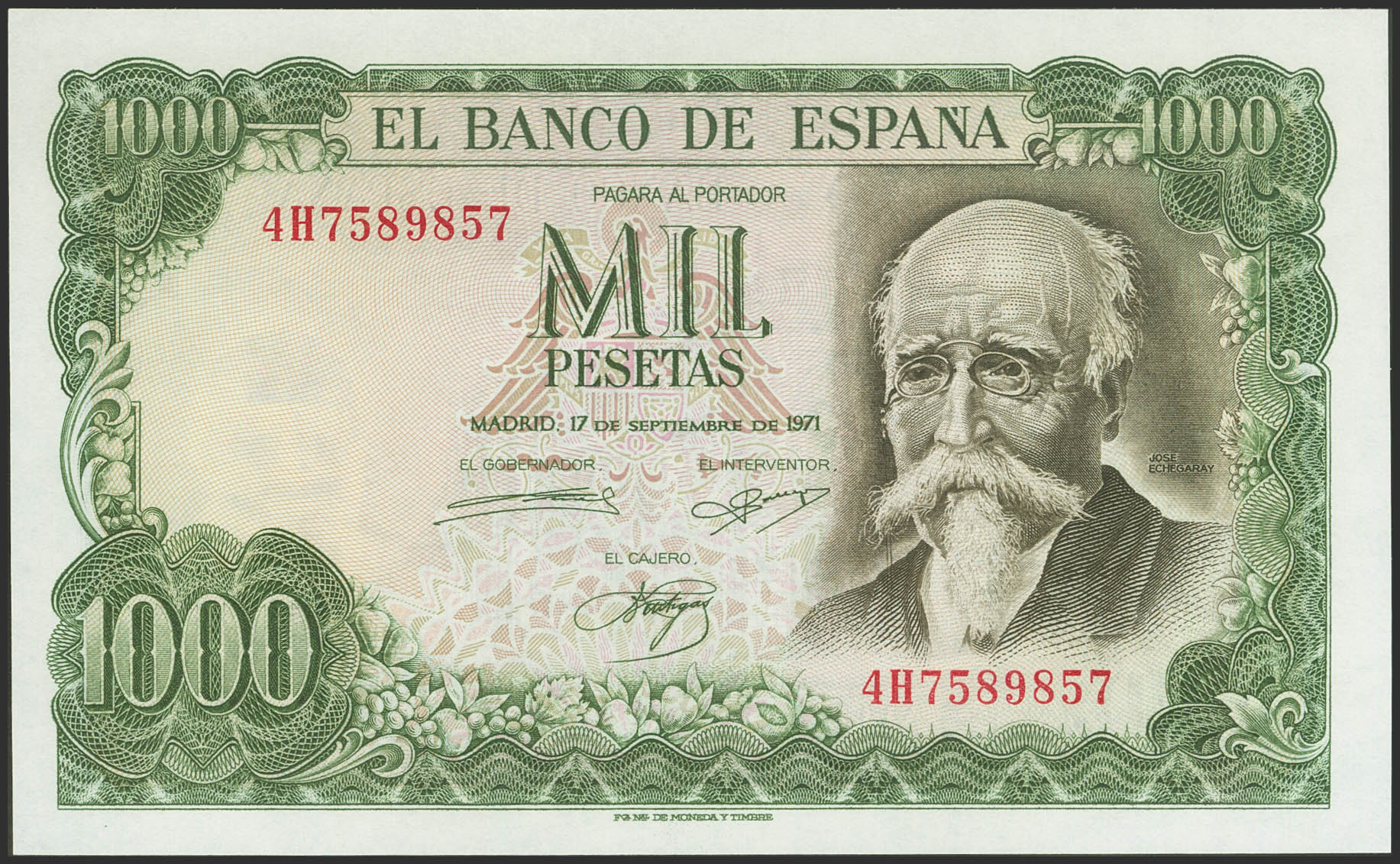 1000 Pesetas. September 17, 1971. Series 4H. (Edifil 2023: 474c). Original sizing. Uncirculated.