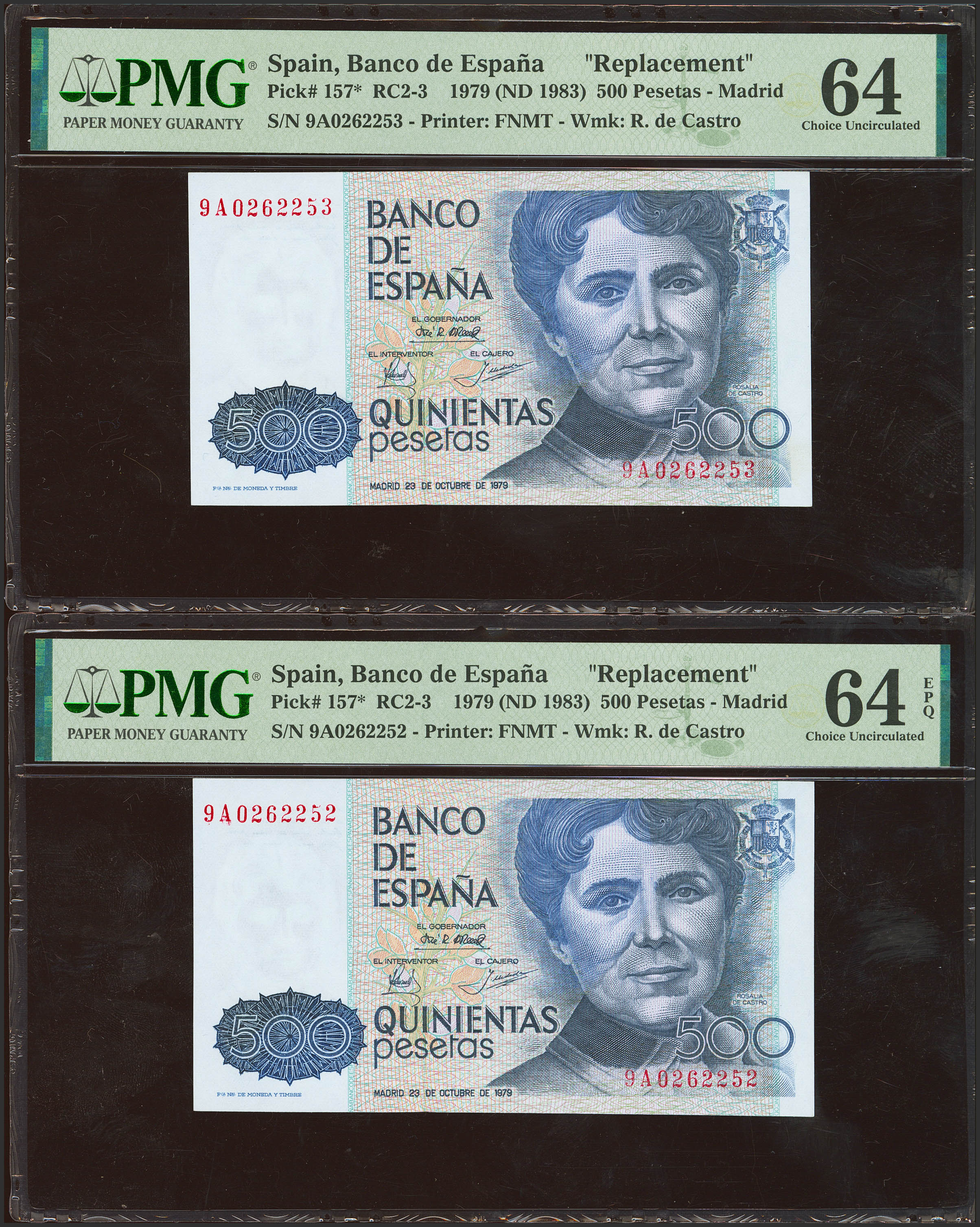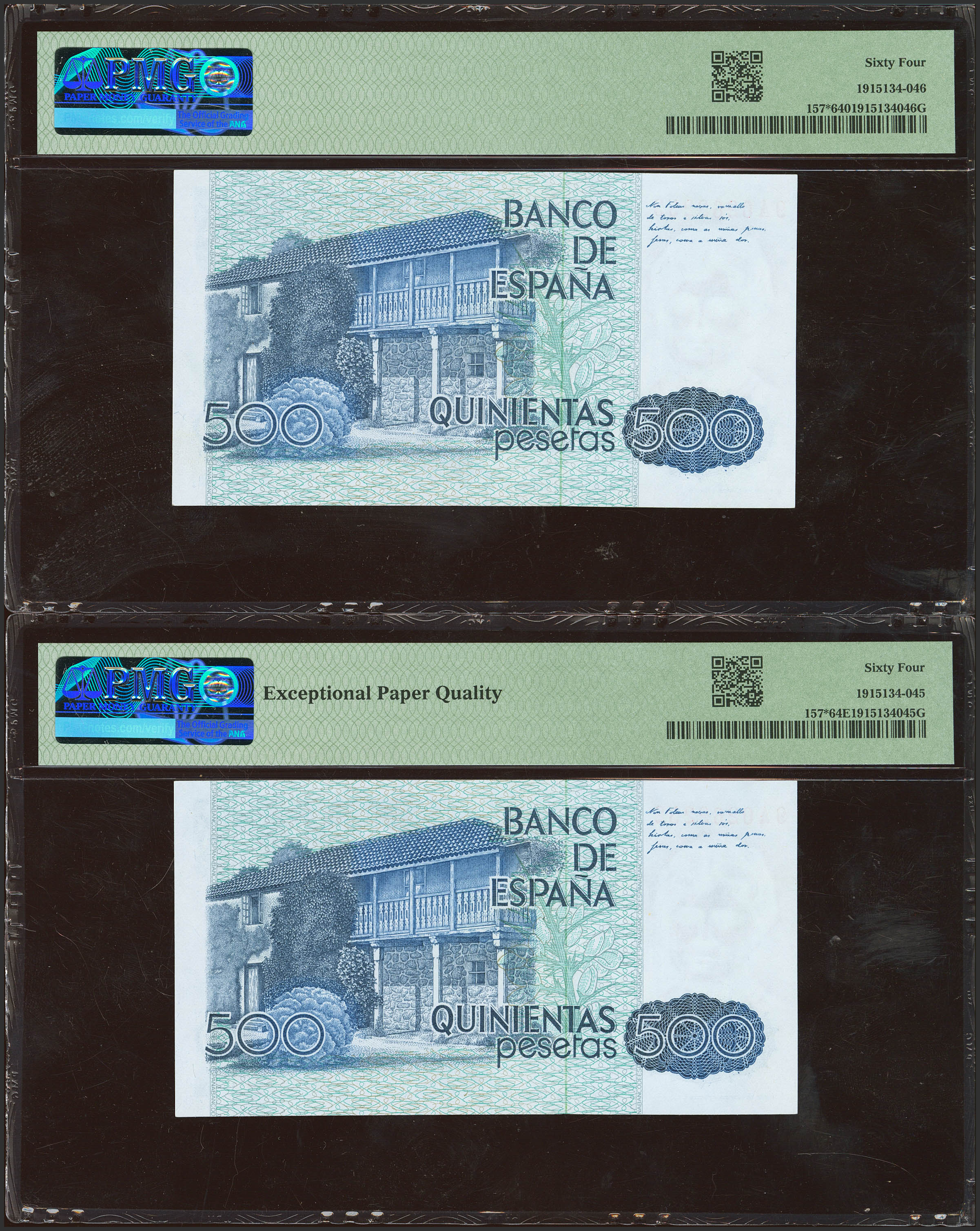500 Pesetas. October 23, 1979. Correlative couple. Special series 9A. (Edifil 2023: 476b, Pick: 157*). Uncirculated. PMG64EPQ/64 packages.