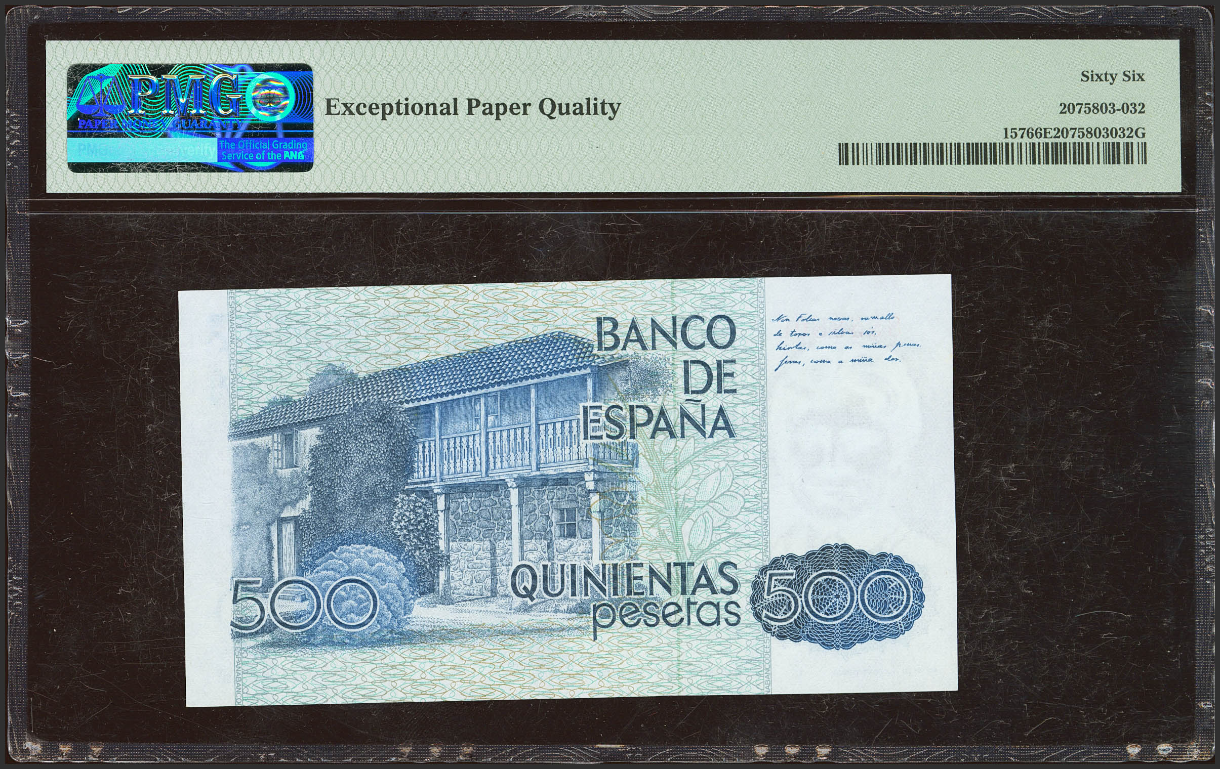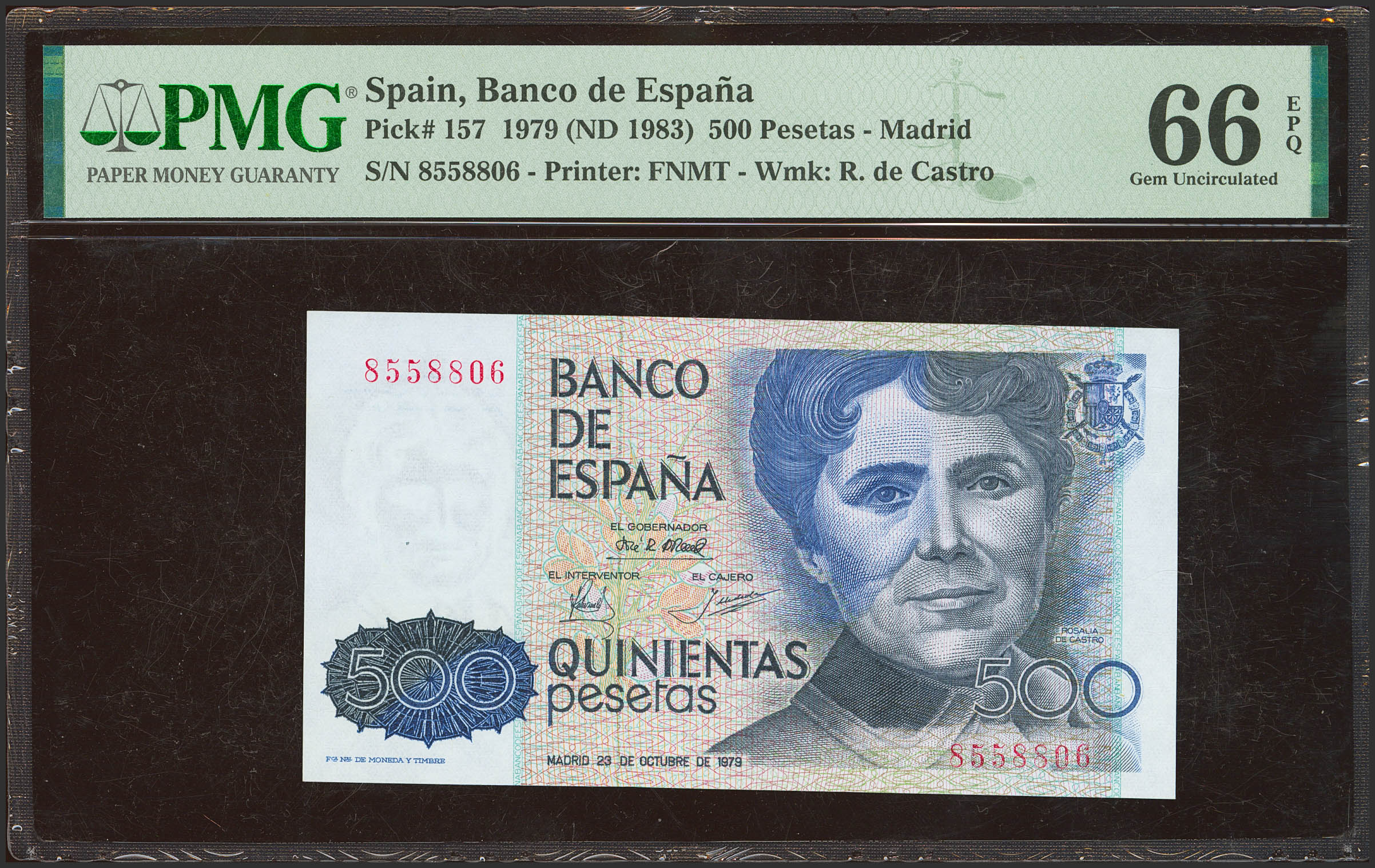 500 Pesetas. October 23, 1979. No series. (Edifil 2023: 476, Pick: 157). Unusual in this quality. Uncirculated. PMG66EPQ package.