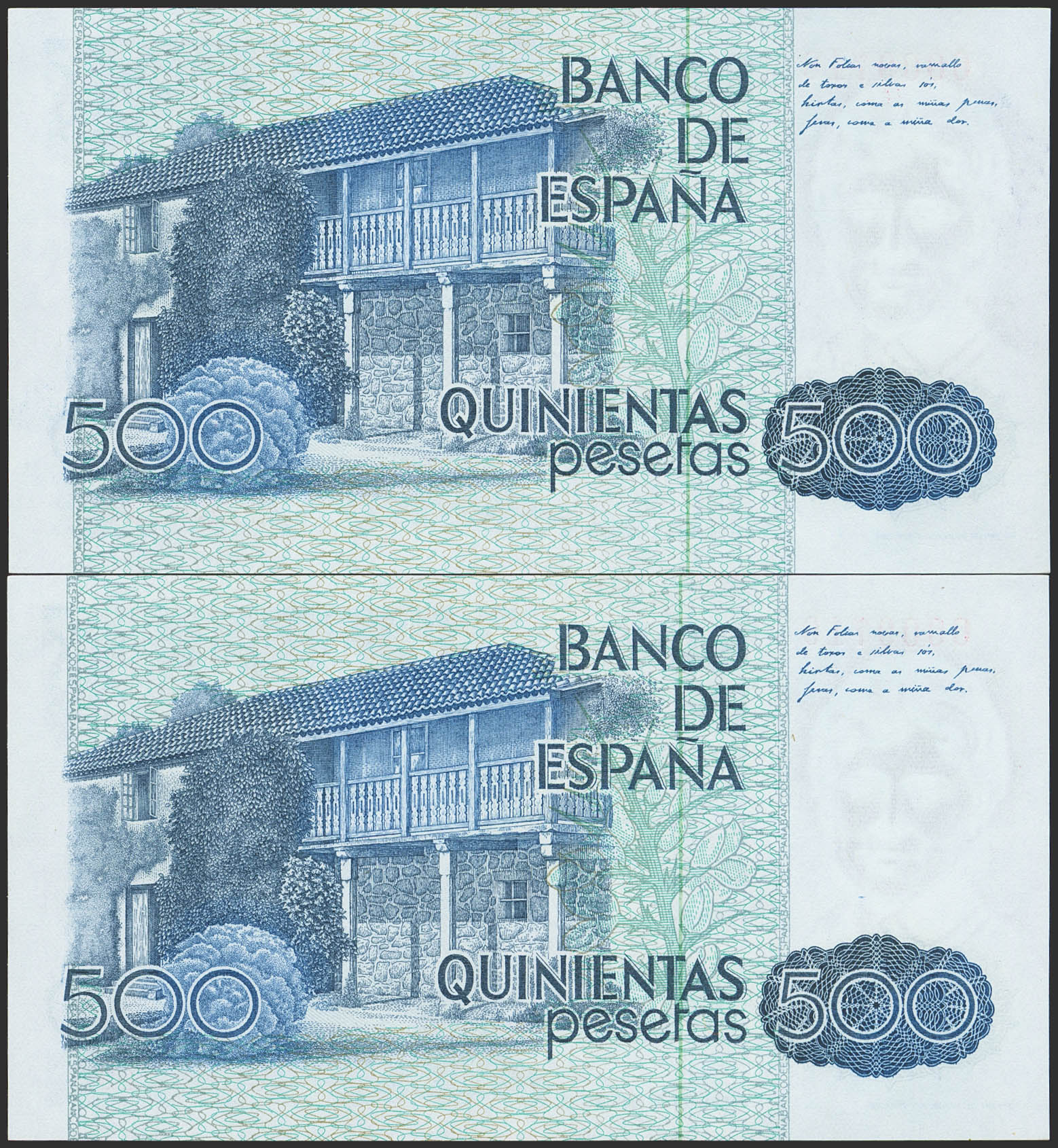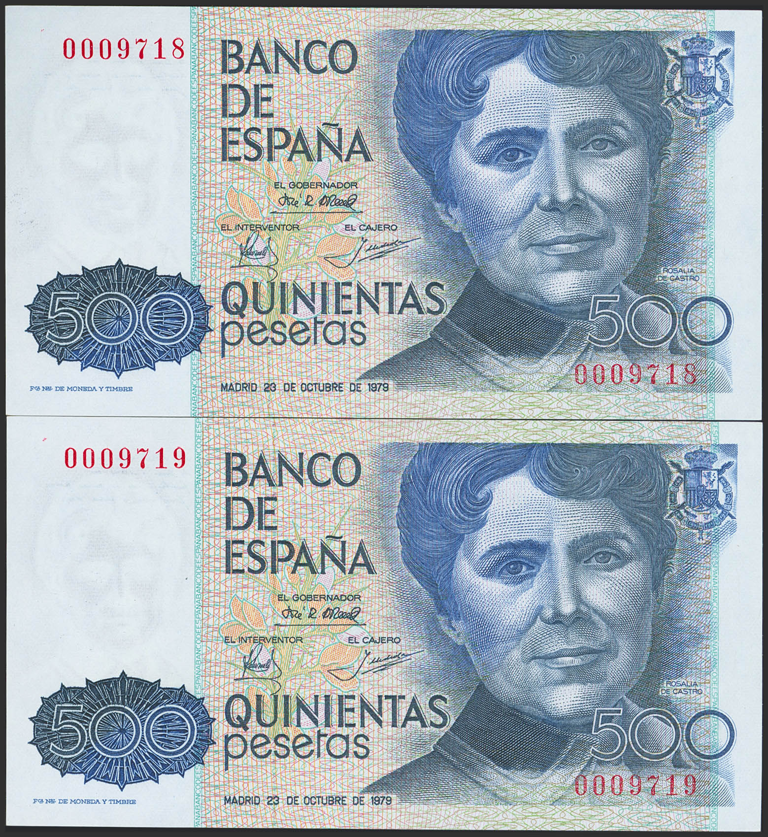 English 500 Pesetas. October 23, 1979. Correlative couple. Without series and very low numbering. (Edifil 2023: 476). Uncirculated.
