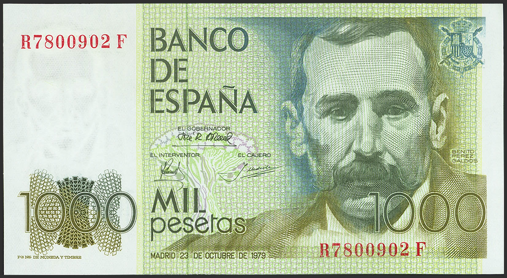 1000 Pesetas. October 23, 1979. RF Series. (Edifil 2023: 477a). With natural undulation from the manufacturing process (this is the only reason for "removing" the Uncirculated). Good Extremely Fine++.