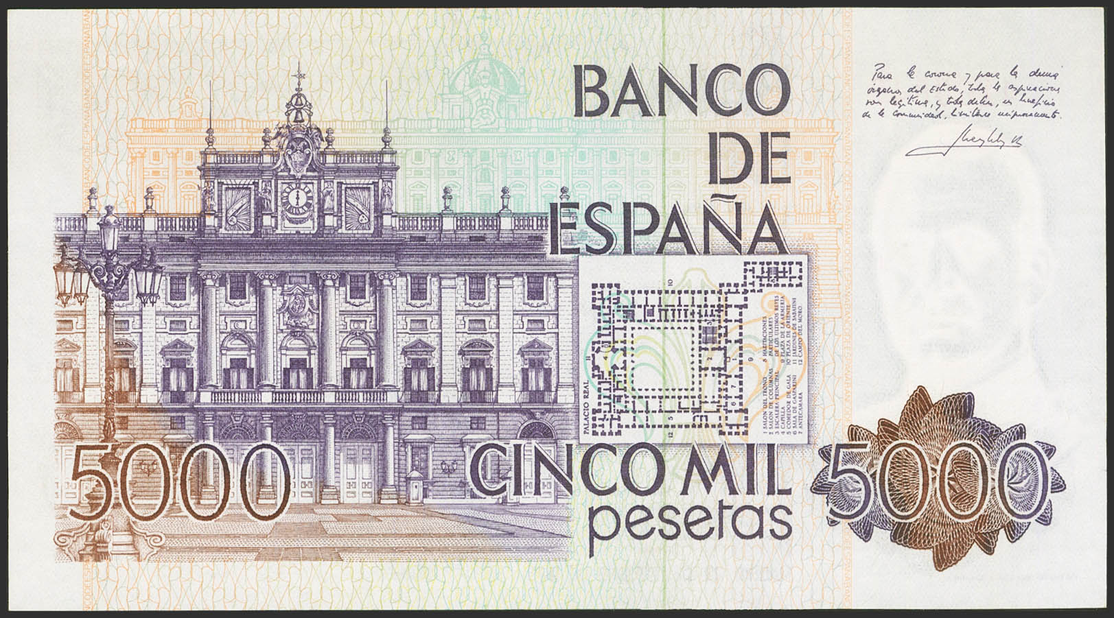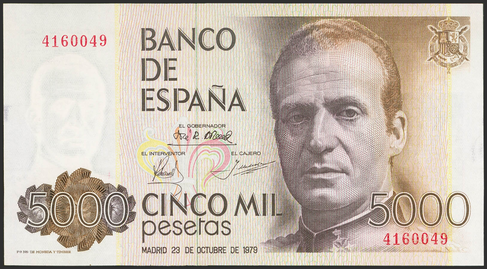 5000 Pesetas. October 23, 1979. No series. (Edifil 2021: 478) Natural undulations from the manufacturing process (this is the only reason for "removing" the Uncirculated). Good Extremely Fine++.