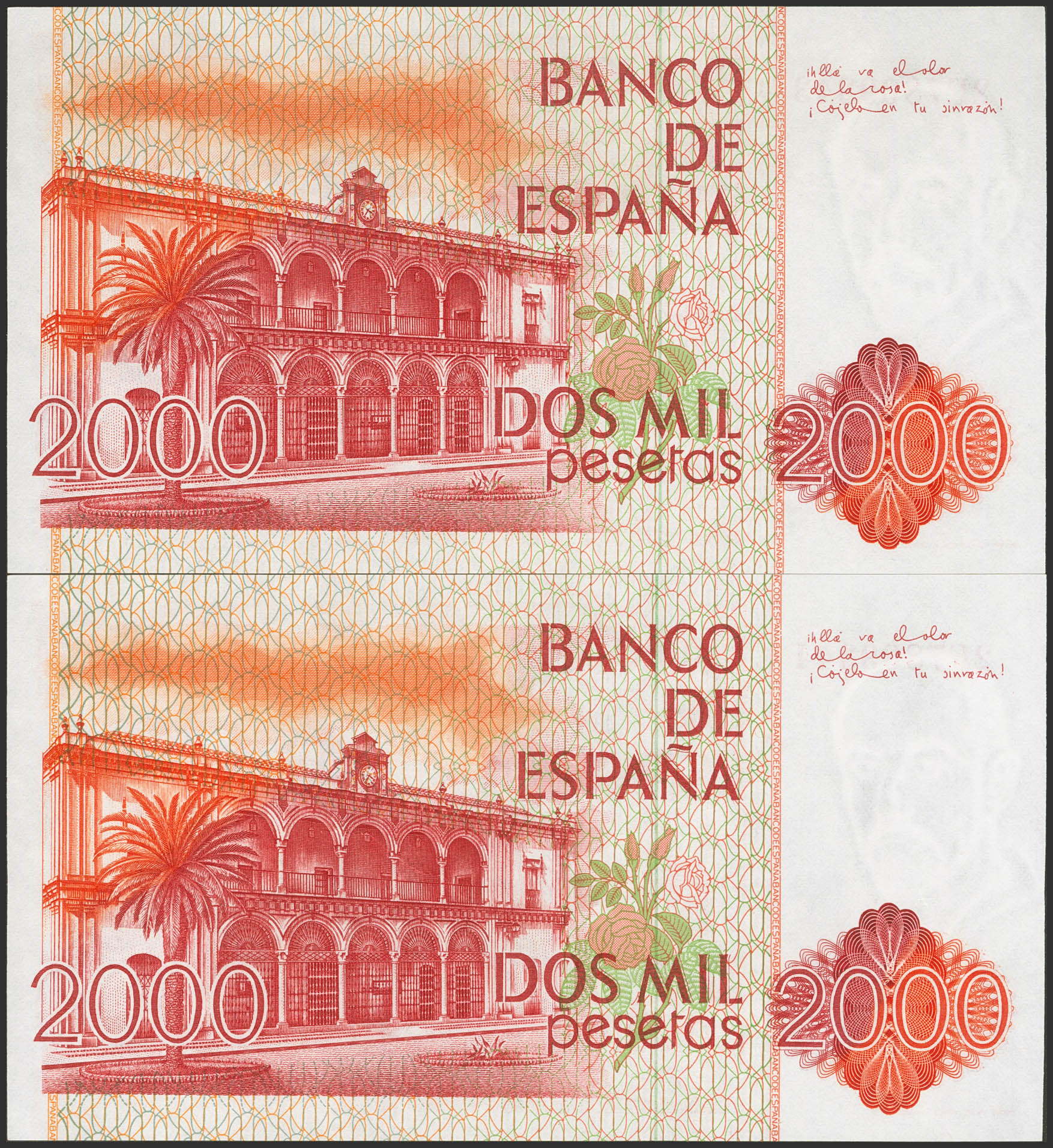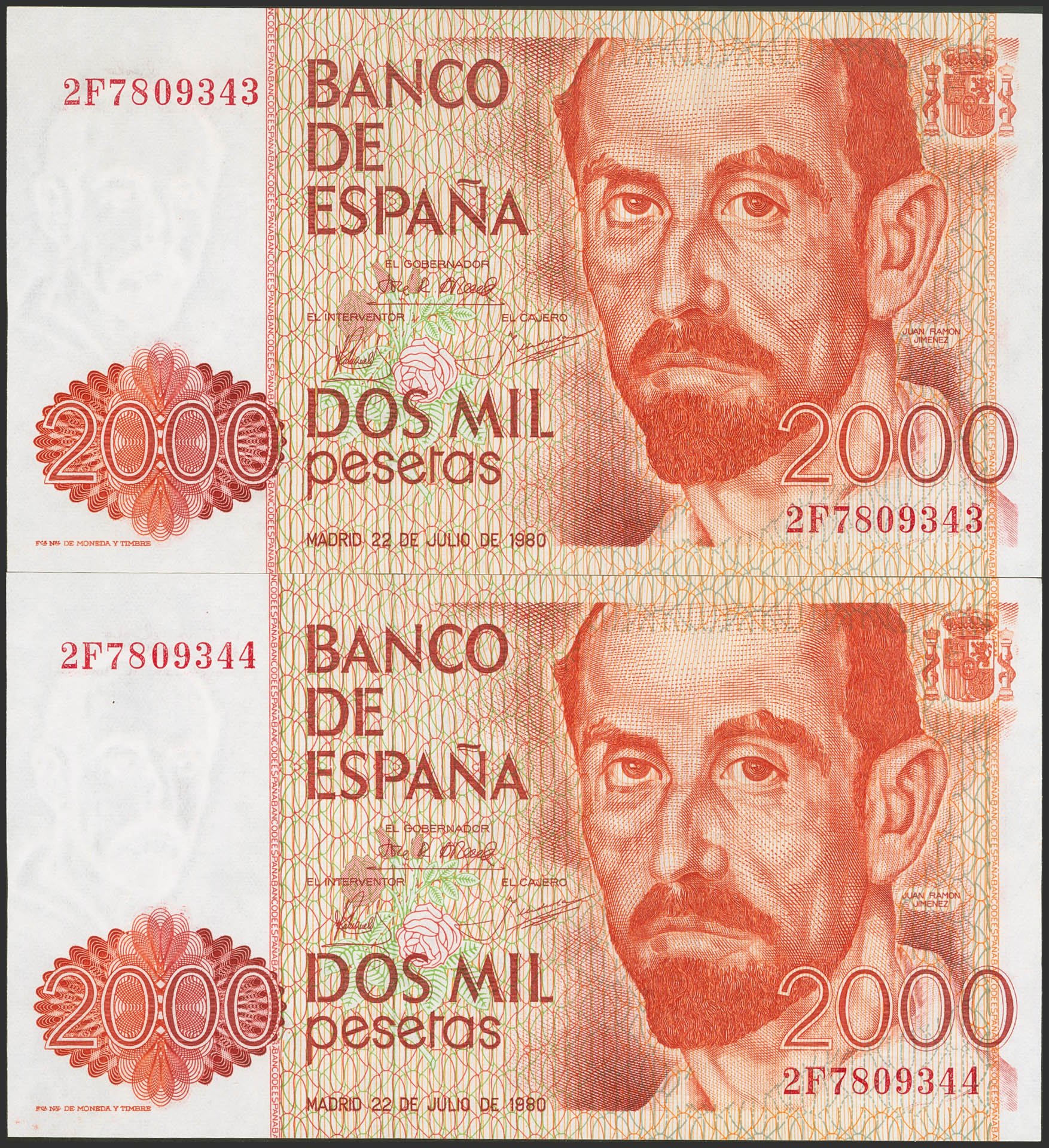 2000 Pesetas. July 22, 1980. Correlative couple. 2F series. (Edifil 2023: 479a). Uncirculated-.