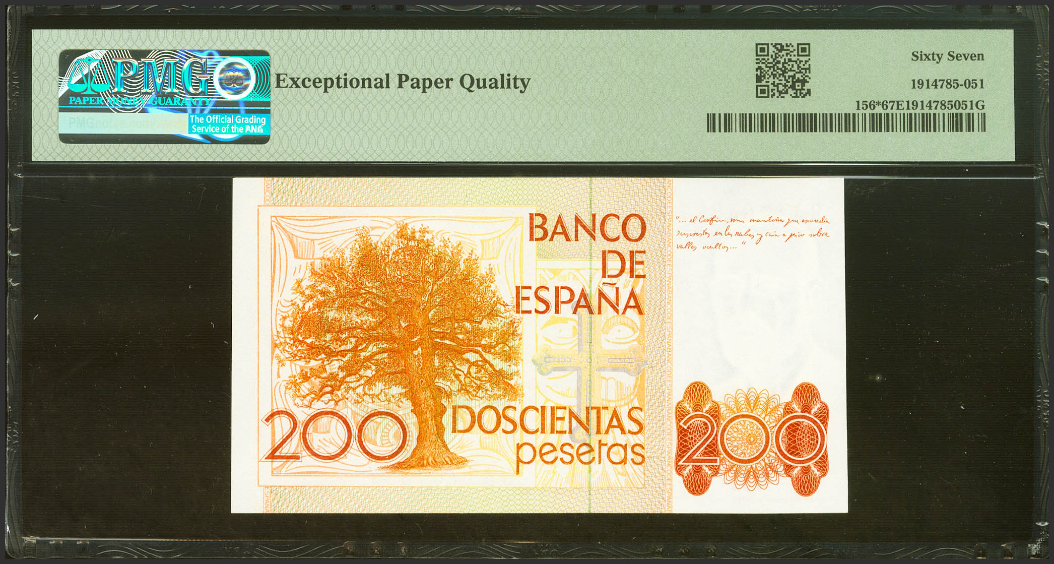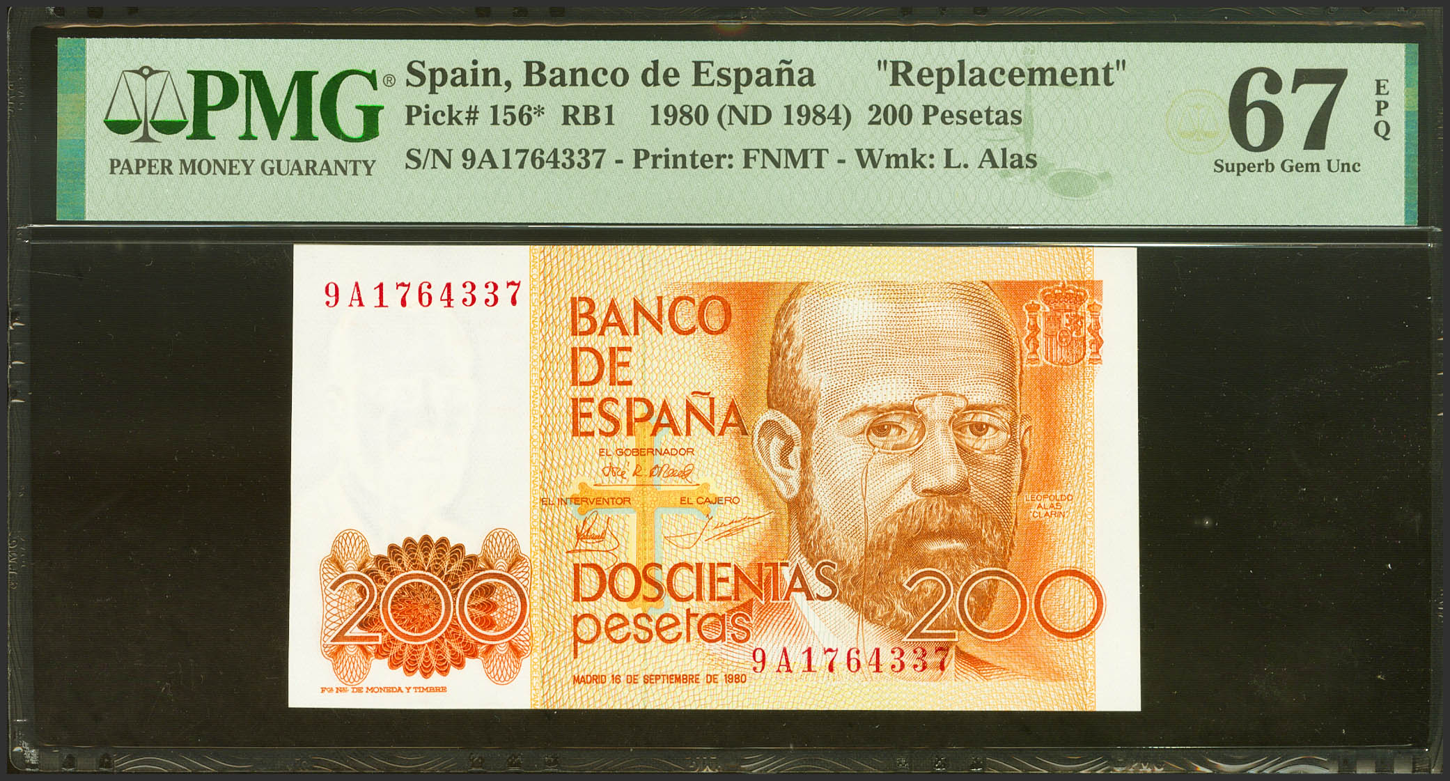 200 Pesetas. September 16, 1980. Special series 9A. (Edifil 2021: 480b, Pick: 156*). Unusual in this exceptional quality. Uncirculated. PMG67EPQ package.