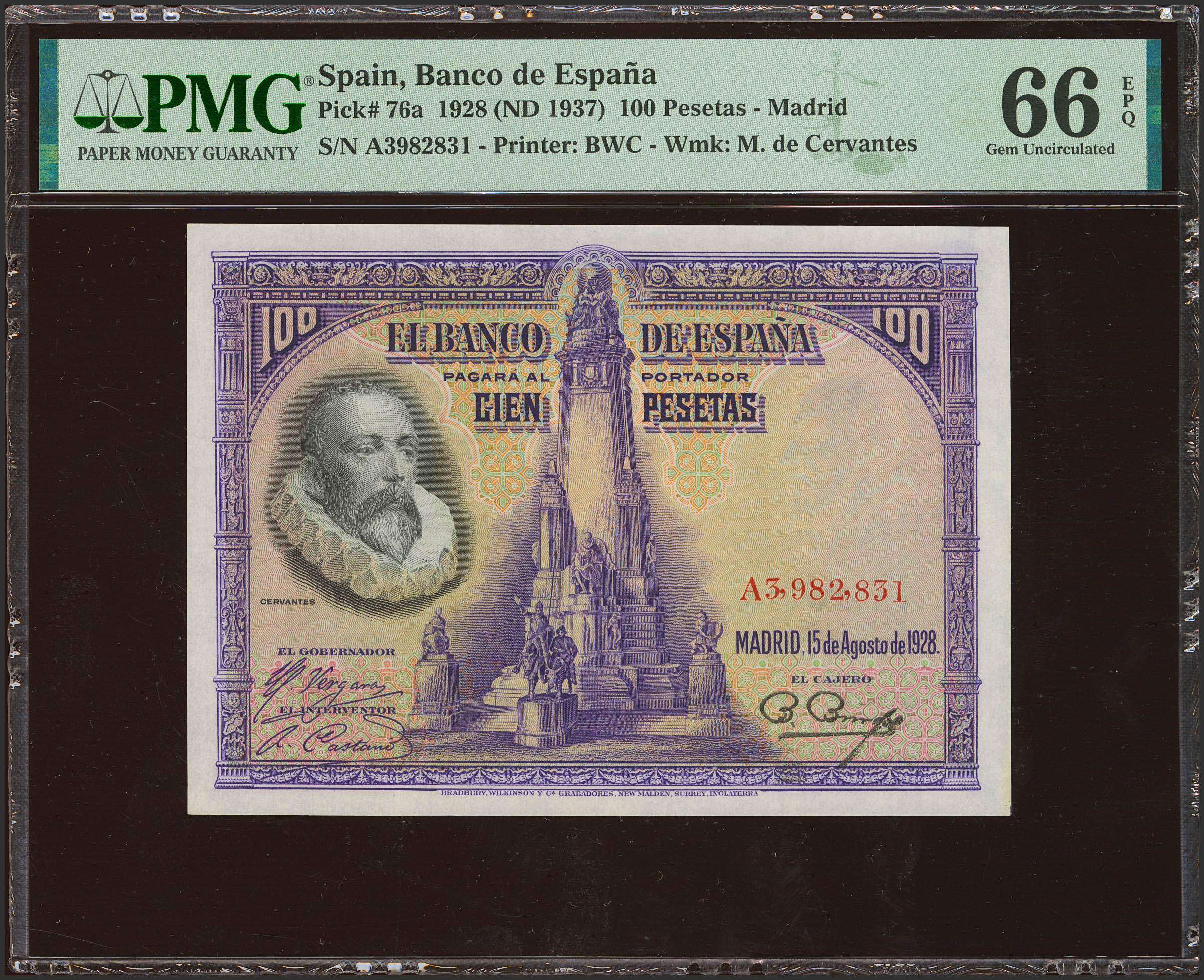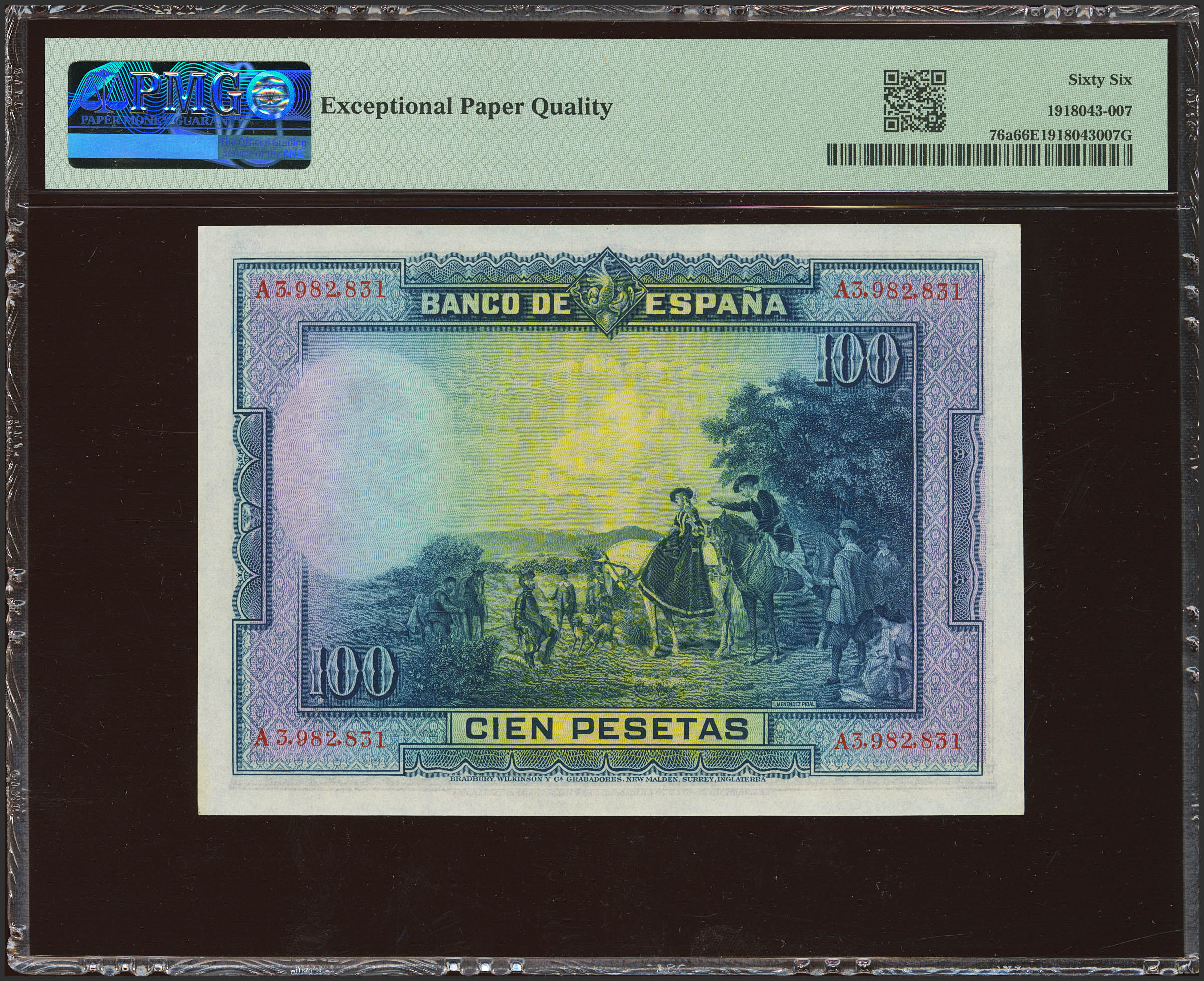 100 Pesetas. August 15, 1928. Series A. (Edifil 2023: 355a, Pick: 76a). Rare in this exceptional quality, original sizing. Uncirculated. PMG66EPQ package.