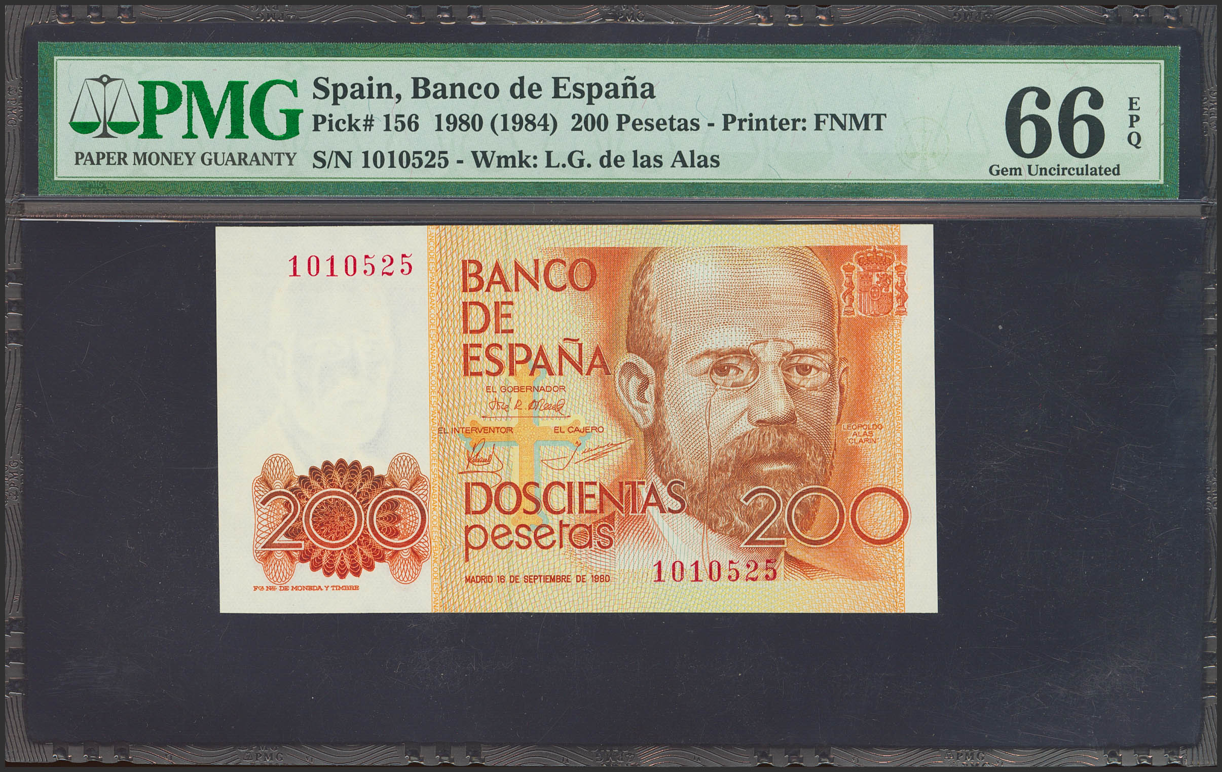 200 Pesetas. September 16, 1980. No series. (Edifil 2023: 480, Pick: 156). Uncirculated. PMG66EPQ package.