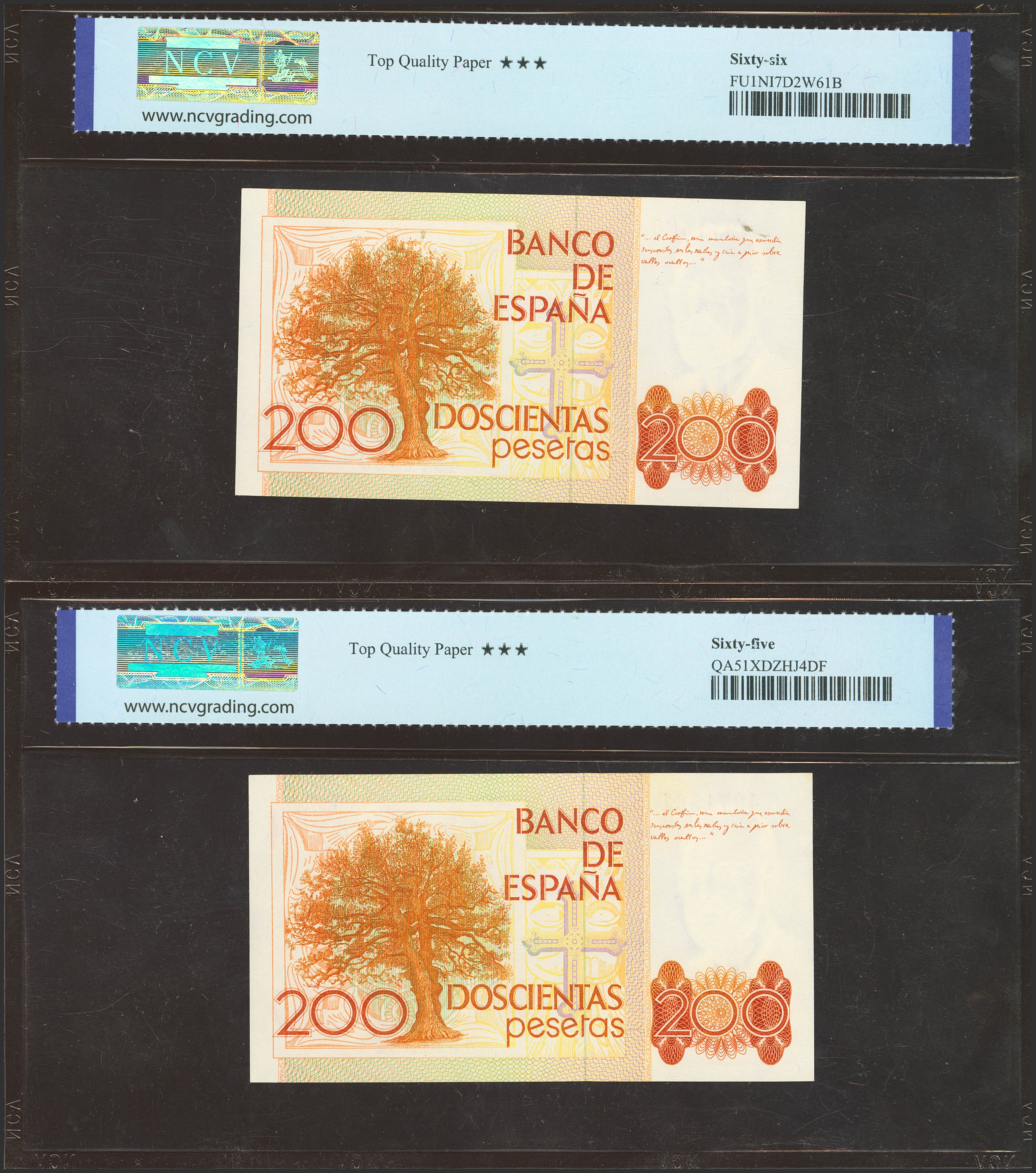 200 Pesetas. September 16, 1980. Correlative couple. No serie. (Edifil 2023: 480, Pick: 156). Uncirculated. NCV66TQP/65TQP packages.