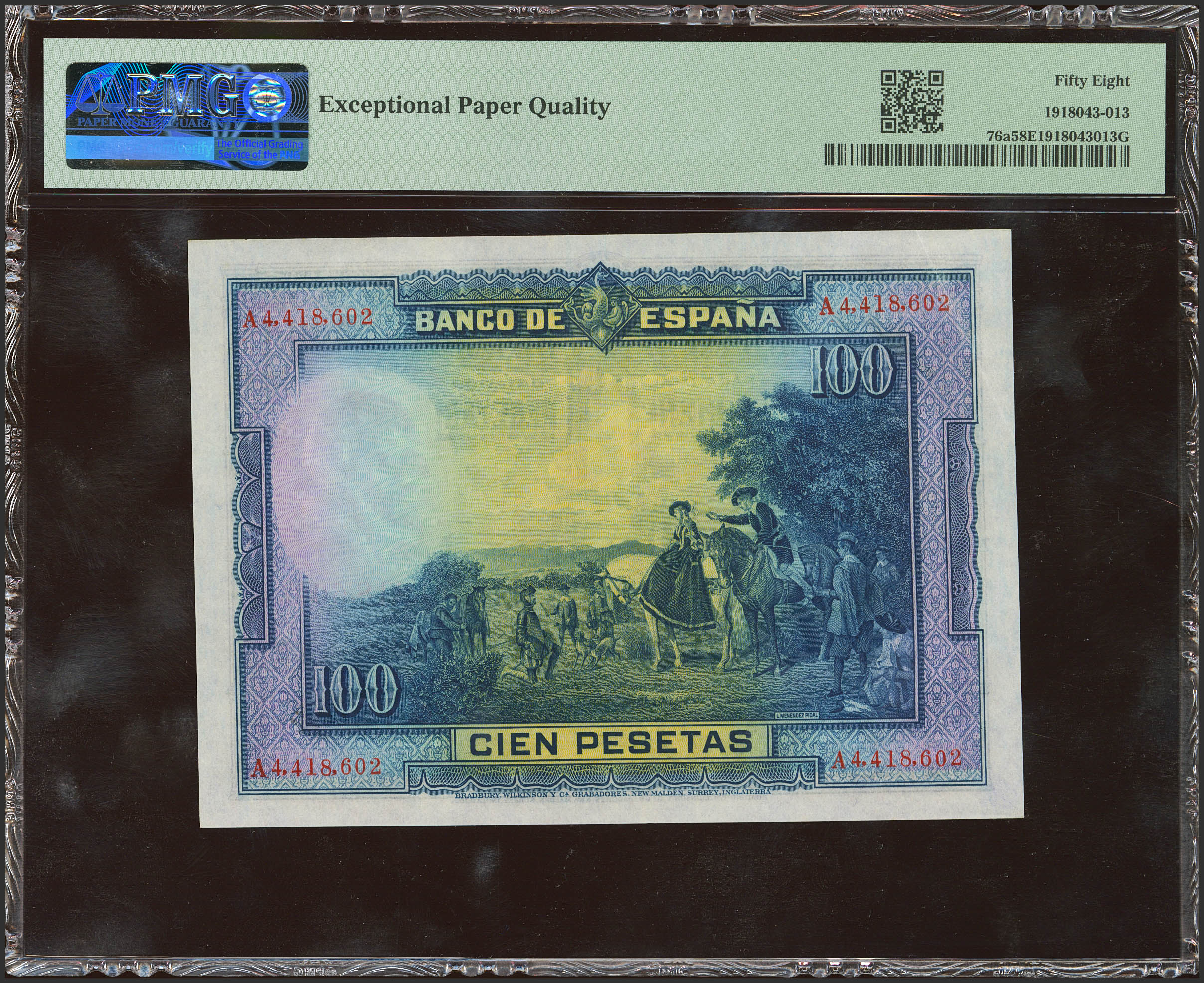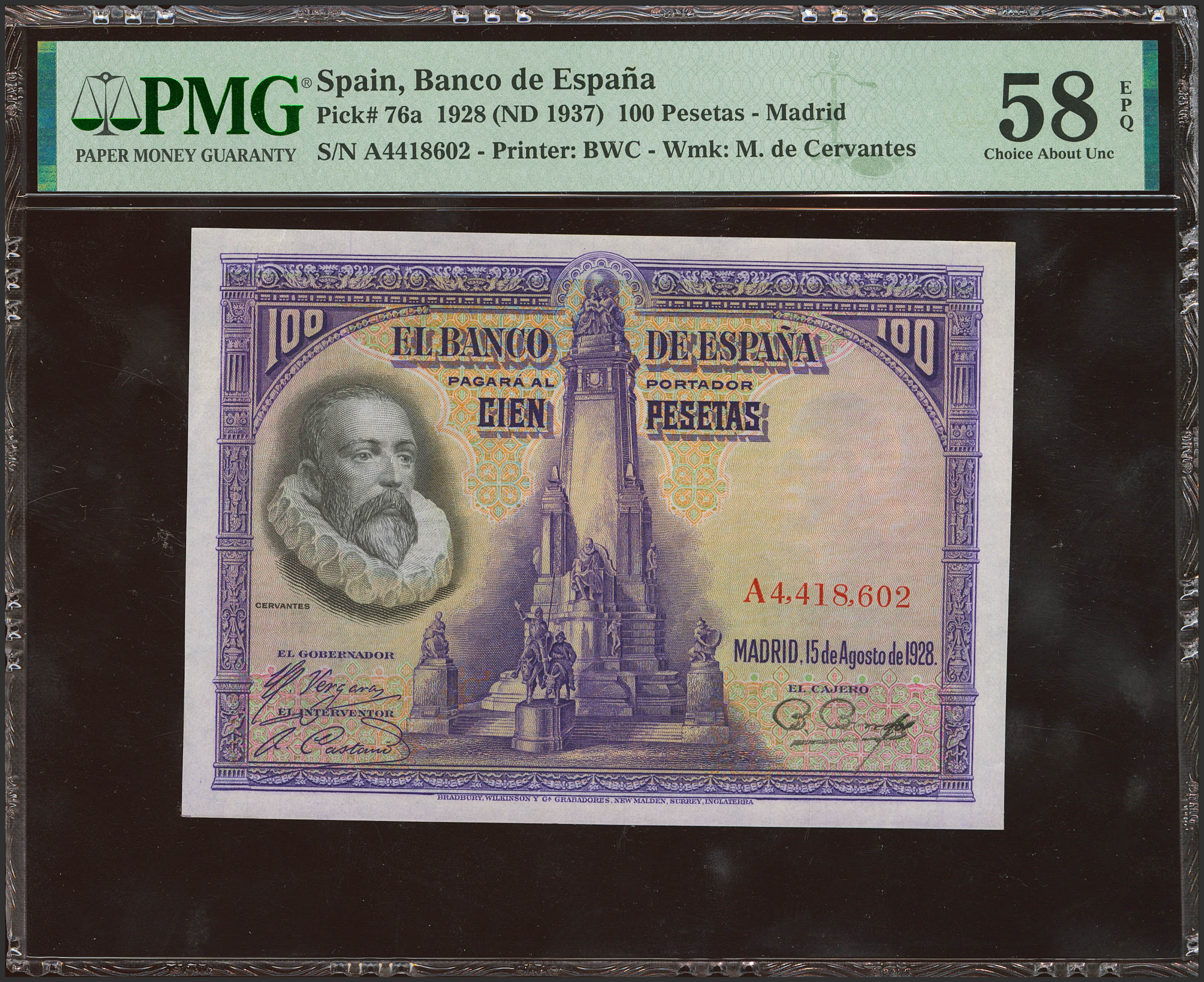 100 Pesetas. August 15, 1928. Series A. (Edifil 2021: 355a). Original sizing. Good Extremely Fine++. PMG58EPQ package.