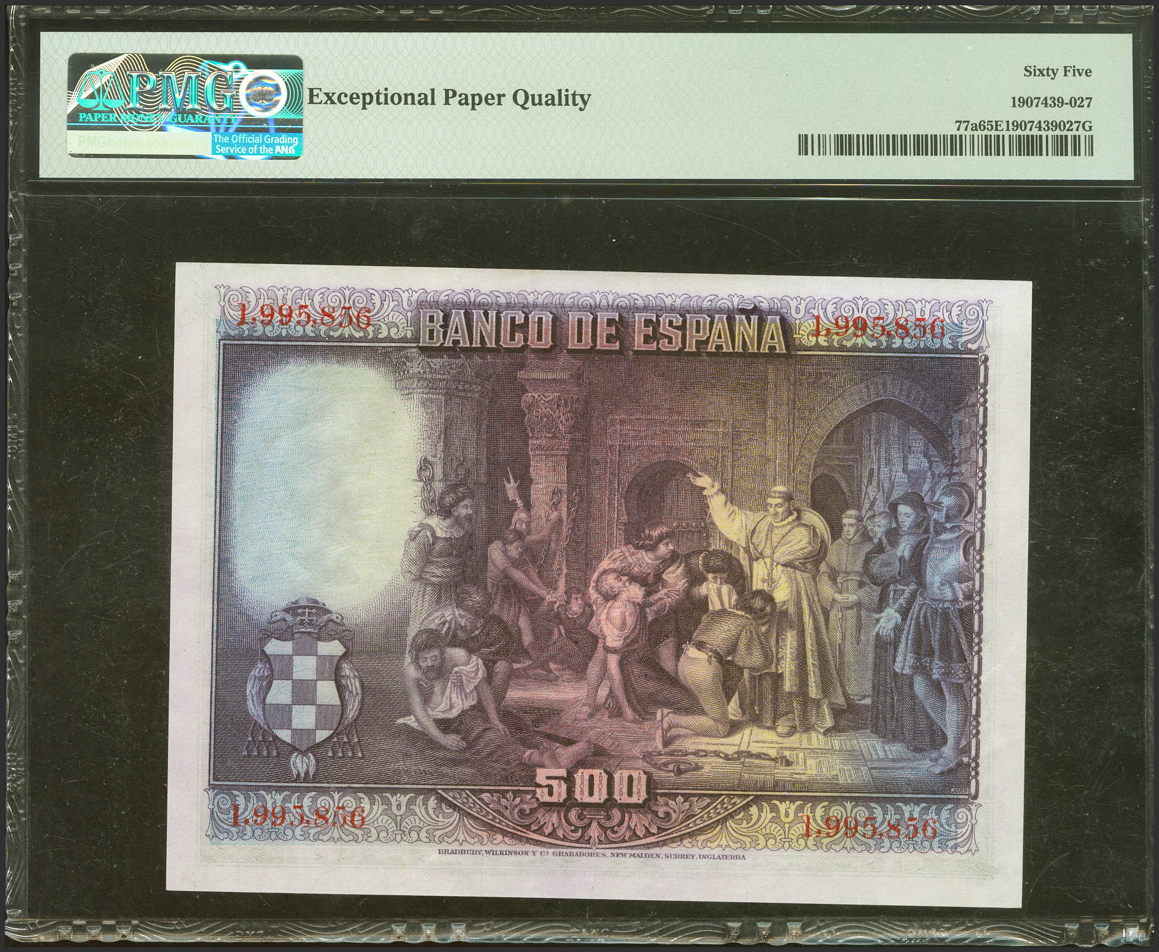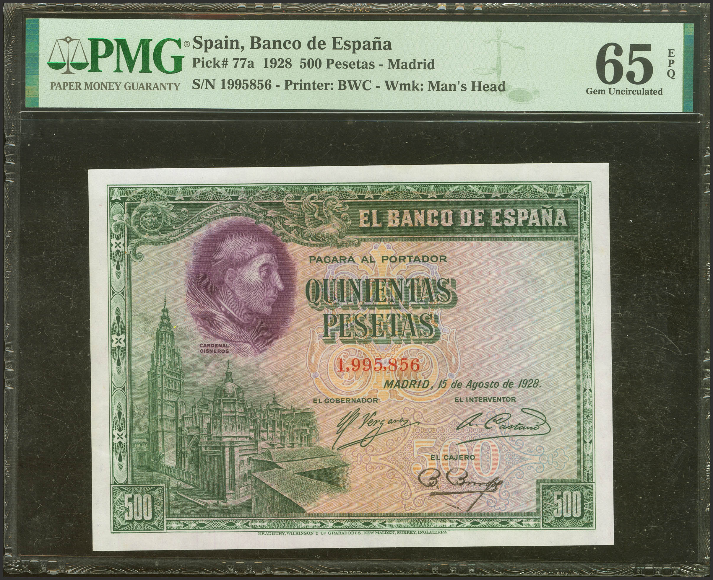 500 Pesetas. August 15, 1928. No series. (Edifil 2021: 356, Pick: 77a). Original sizing. Uncirculated. PMG65EPQ package.