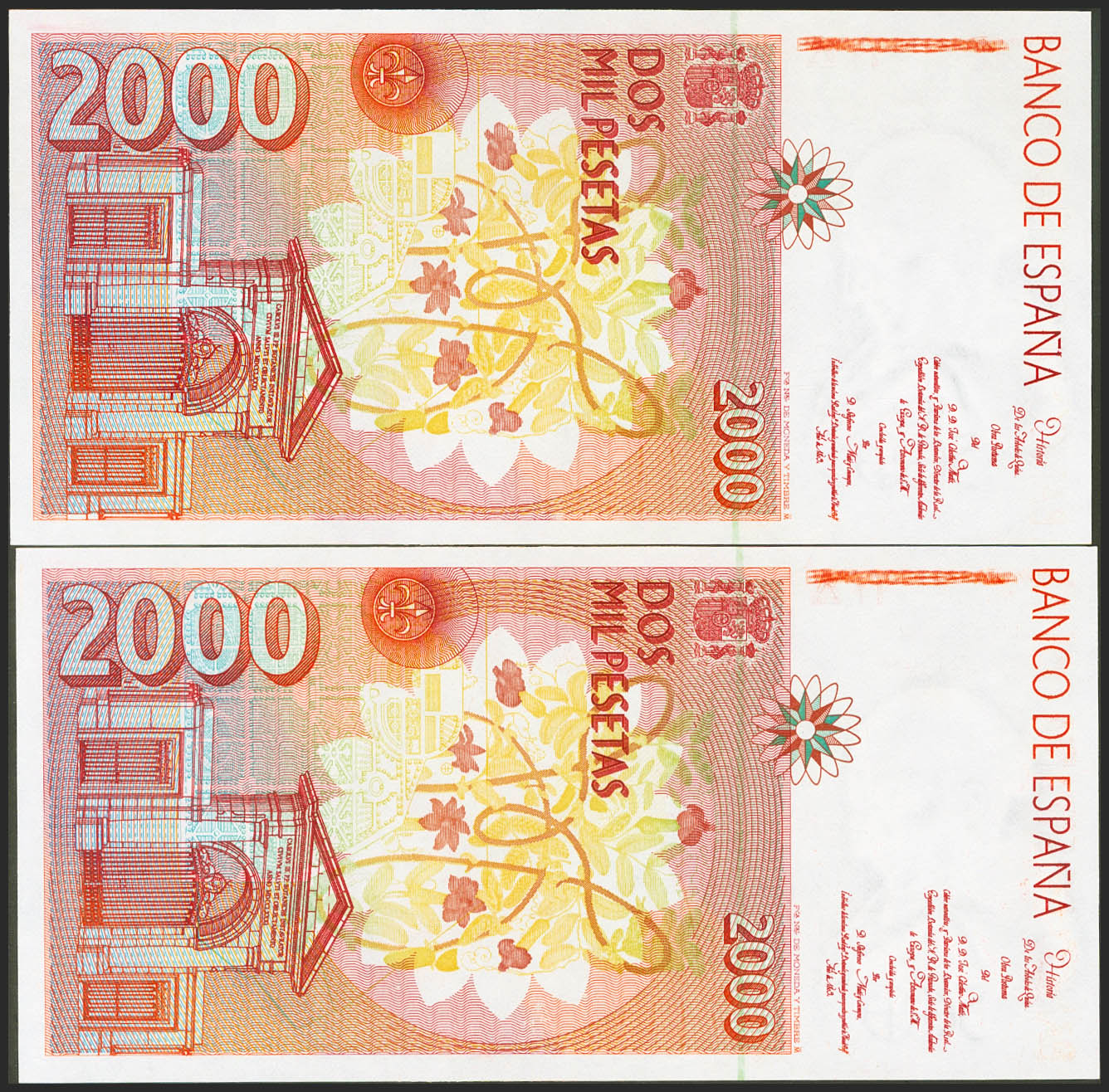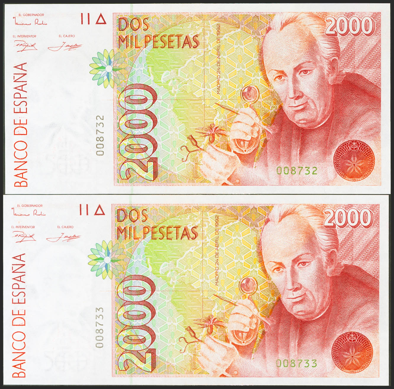 2000 Pesetas. April 24, 1992. Correlative couple. Without series and very low numbering. (Edifil 2021: 482). Uncirculated.
