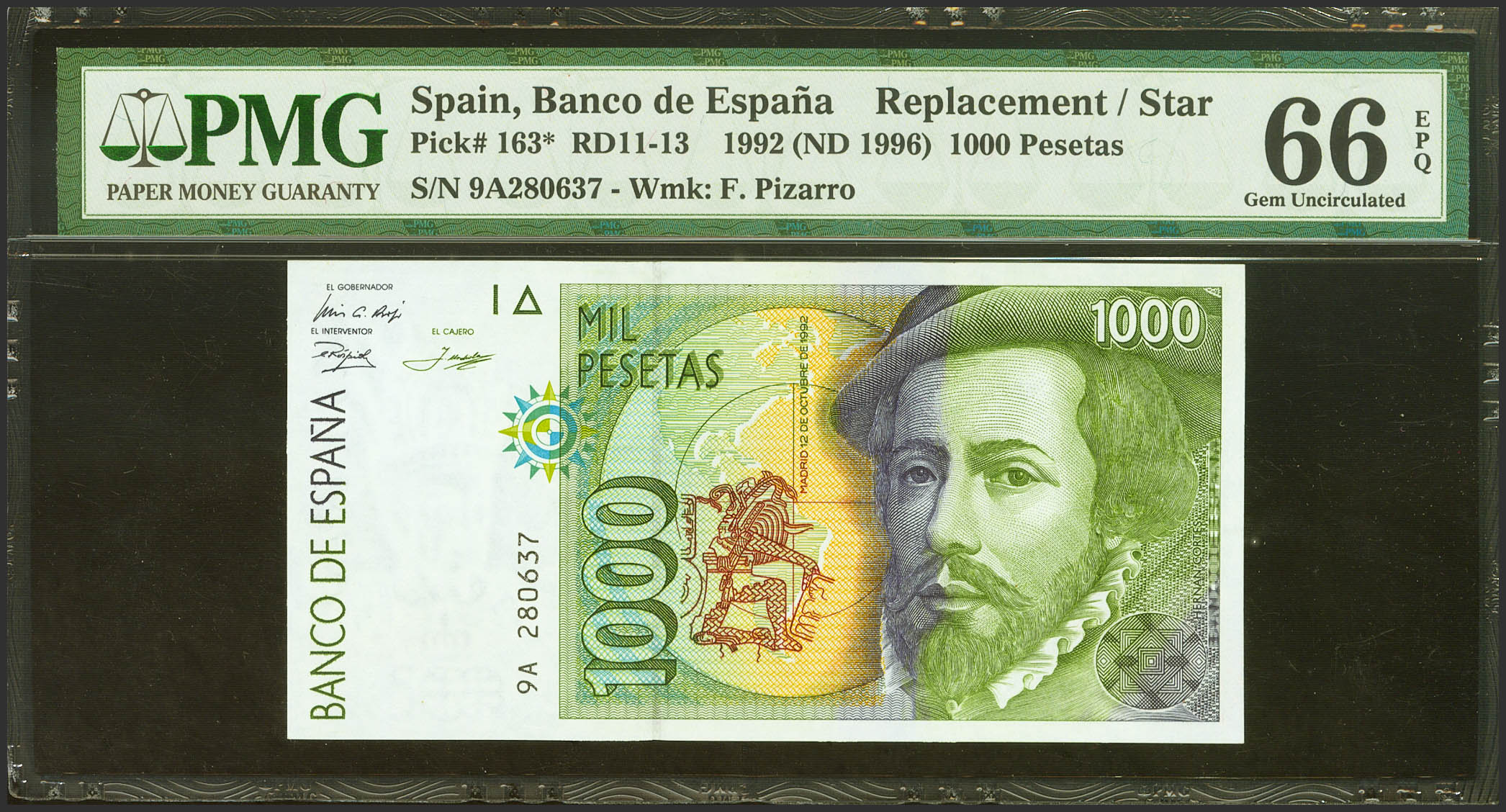 1000 Pesetas. October 12, 1992. Special series 9A. (Edifil 2021: 483c, Pick: 163*). Unusual in this exceptional quality. Uncirculated. PMG66EPQ package.