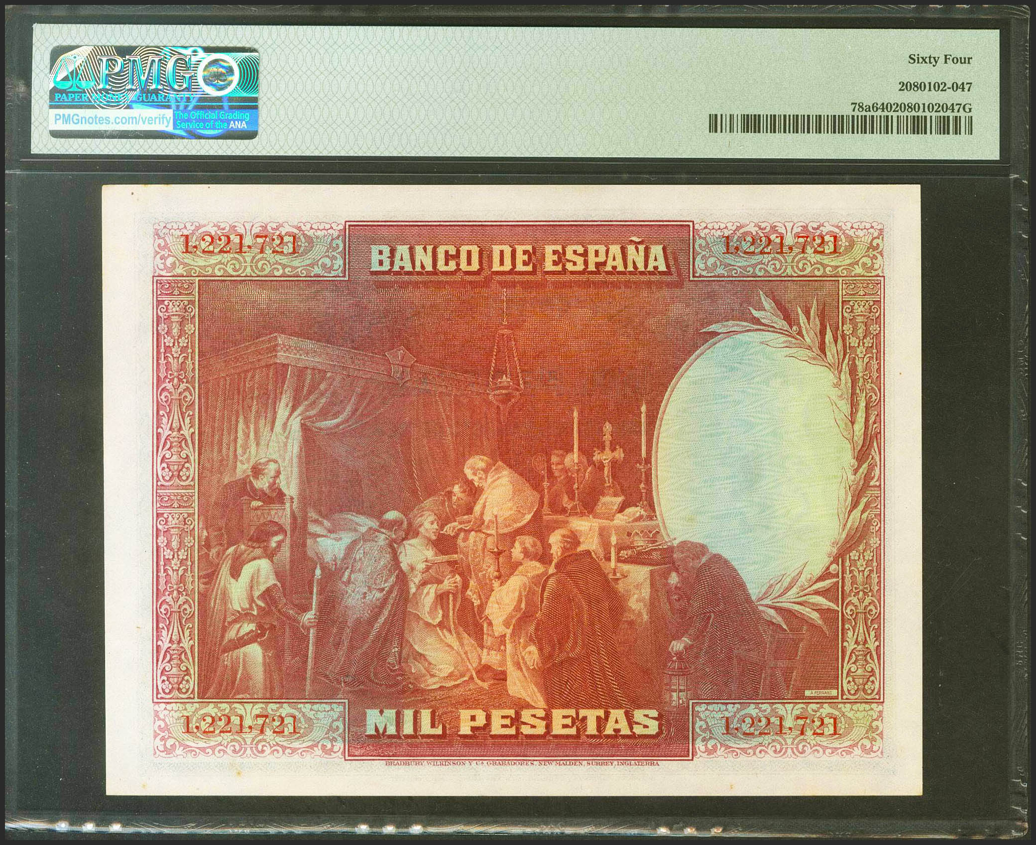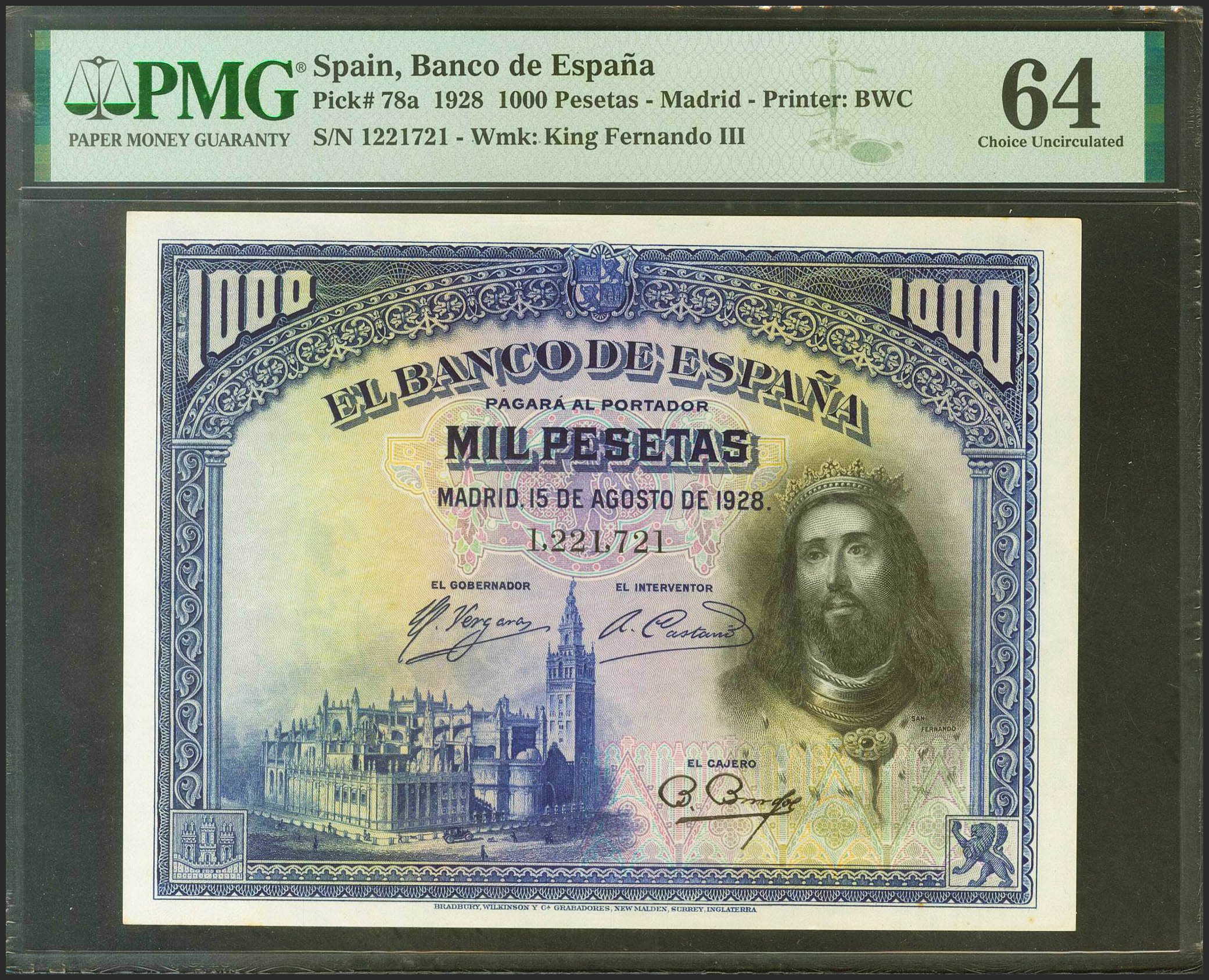 English 1000 Pesetas. August 15, 1928. No series. (Edifil 2021: 357, Pick: 78a). Unusual in this quality. Uncirculated. PMG64 encapsulation.