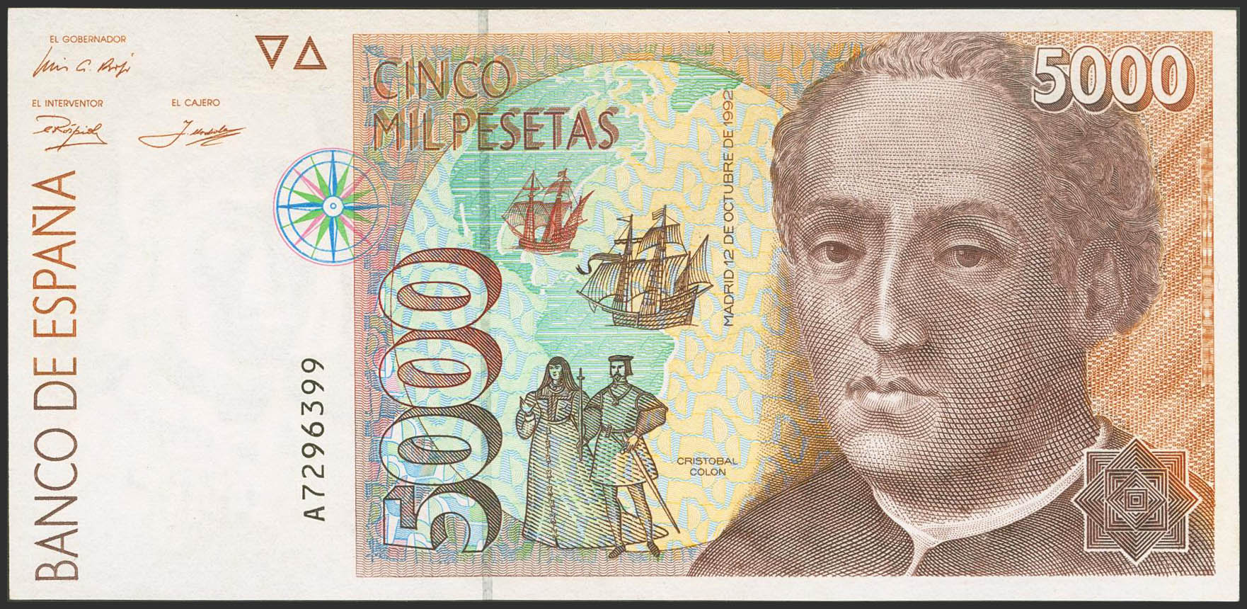 5000 Pesetas. October 12, 1992. Series A. (Edifil 2023: 484a). Uncirculated--.