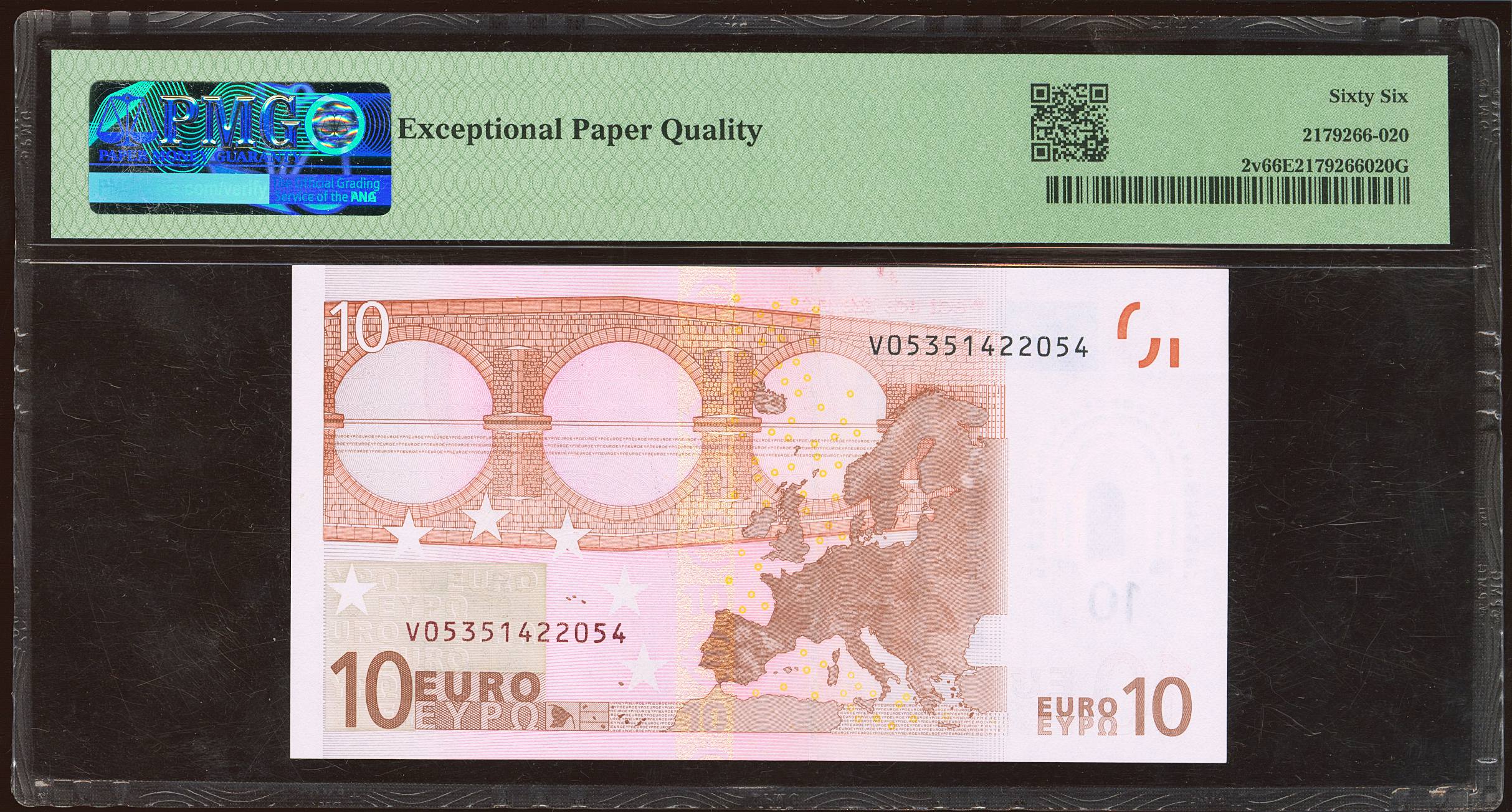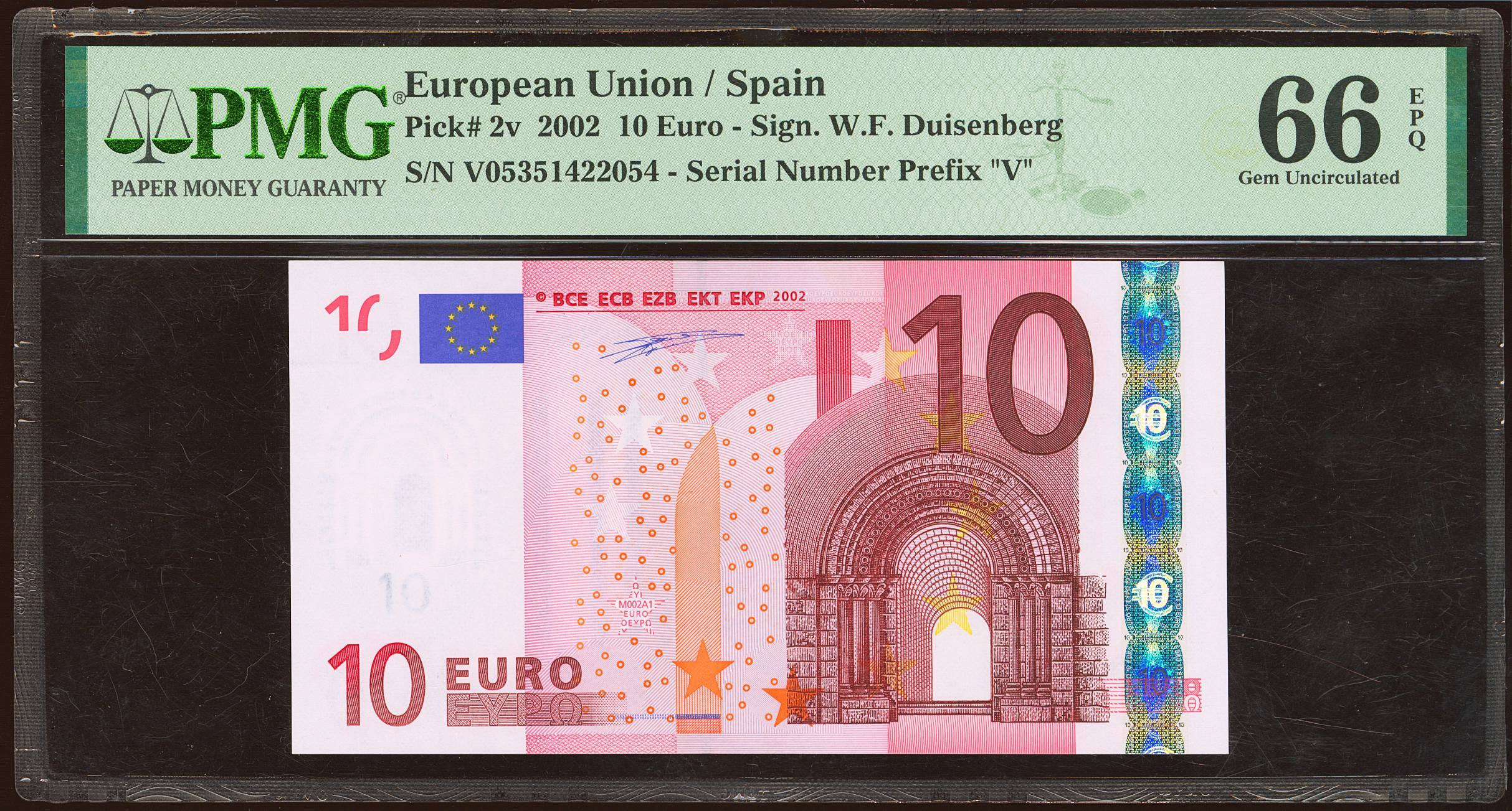 10 euros. January 1, 2002. Signature Duisenberg. Series V (Spain). (Edifil 2023: 487, Pick: 2v). Uncirculated. PMG66EPQ package.