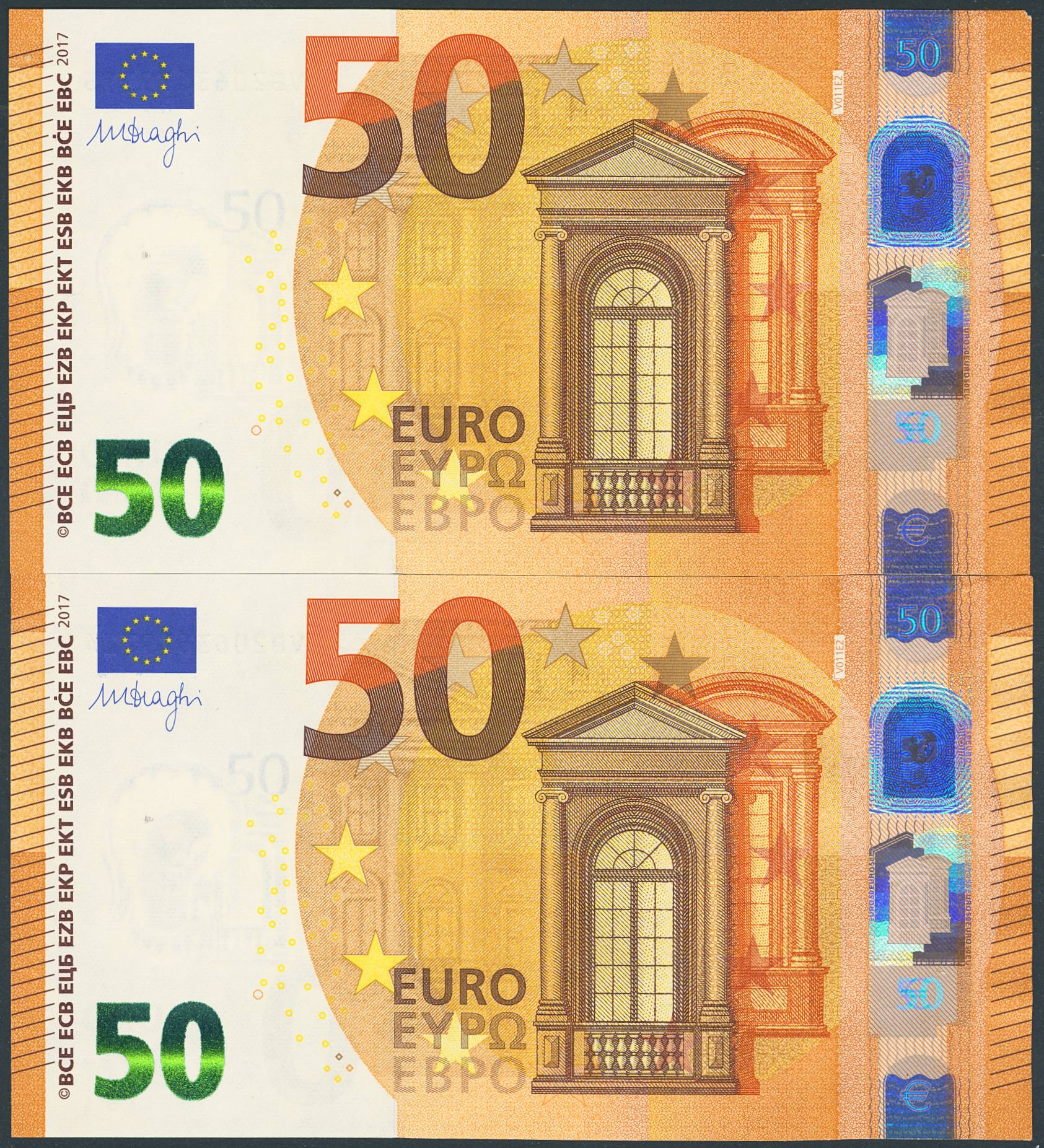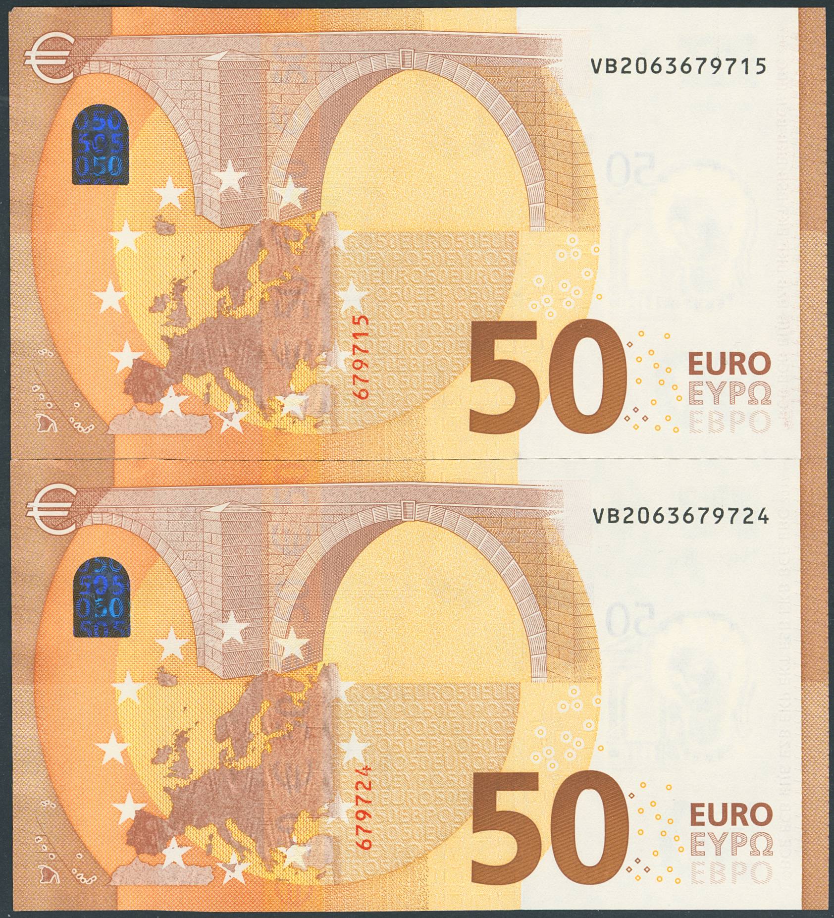 50 euros. April 4, 2017. Correlative pair (it should be remembered that the last digit of all banknotes denominated in euros is for internal control of the European Central Bank, which marks the correlativity of the banknotes is the penultimate digit). Draghi signature. Series V (Spain). (Edifil 2021: 496). One of the bills has a noticeable manufacturing defect in the upper right corner. Uncirculated.