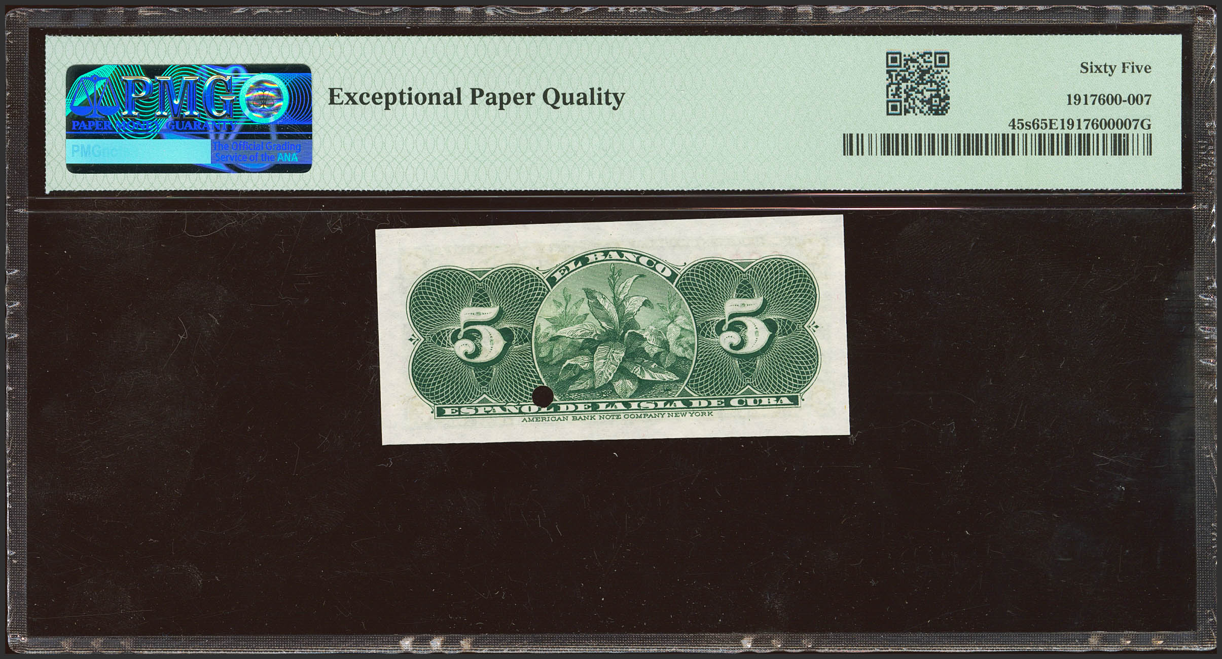 BANCO ESPAÑOL DE LA ISLA DE CUBA. 5 Centavos. May 15, 1896. Series J, Specimen and numbering 00000. (Edifil 2023: 69, Pick: 45s). Very rare especially in this exceptional quality. Uncirculated. Encapsulated PMG65EPQ.
