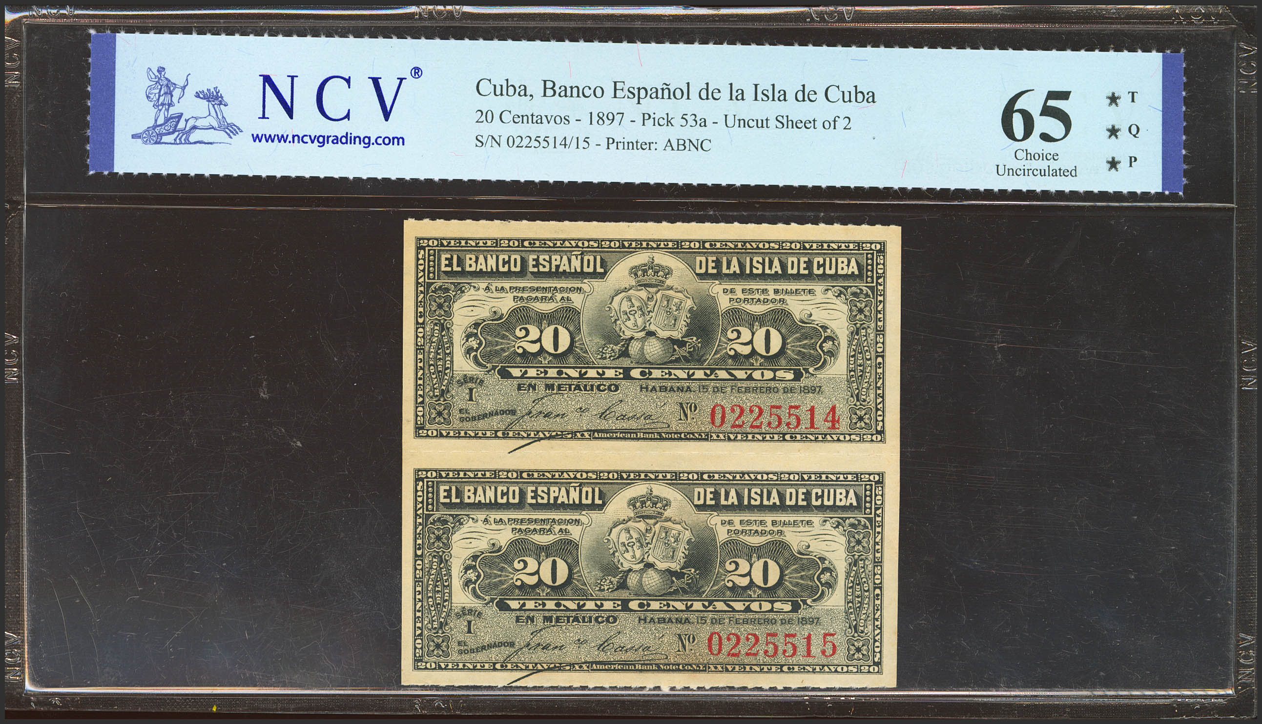 BANCO ESPAÑOL DE LA ISLA DE CUBA. Set of 2 consecutive 20 Centavos banknotes (not detached), issued on February 15, 1897 (Edifil 2023: 85, Pick: 53a). Original size. Uncirculated. Encapsulated NCV65TQP.