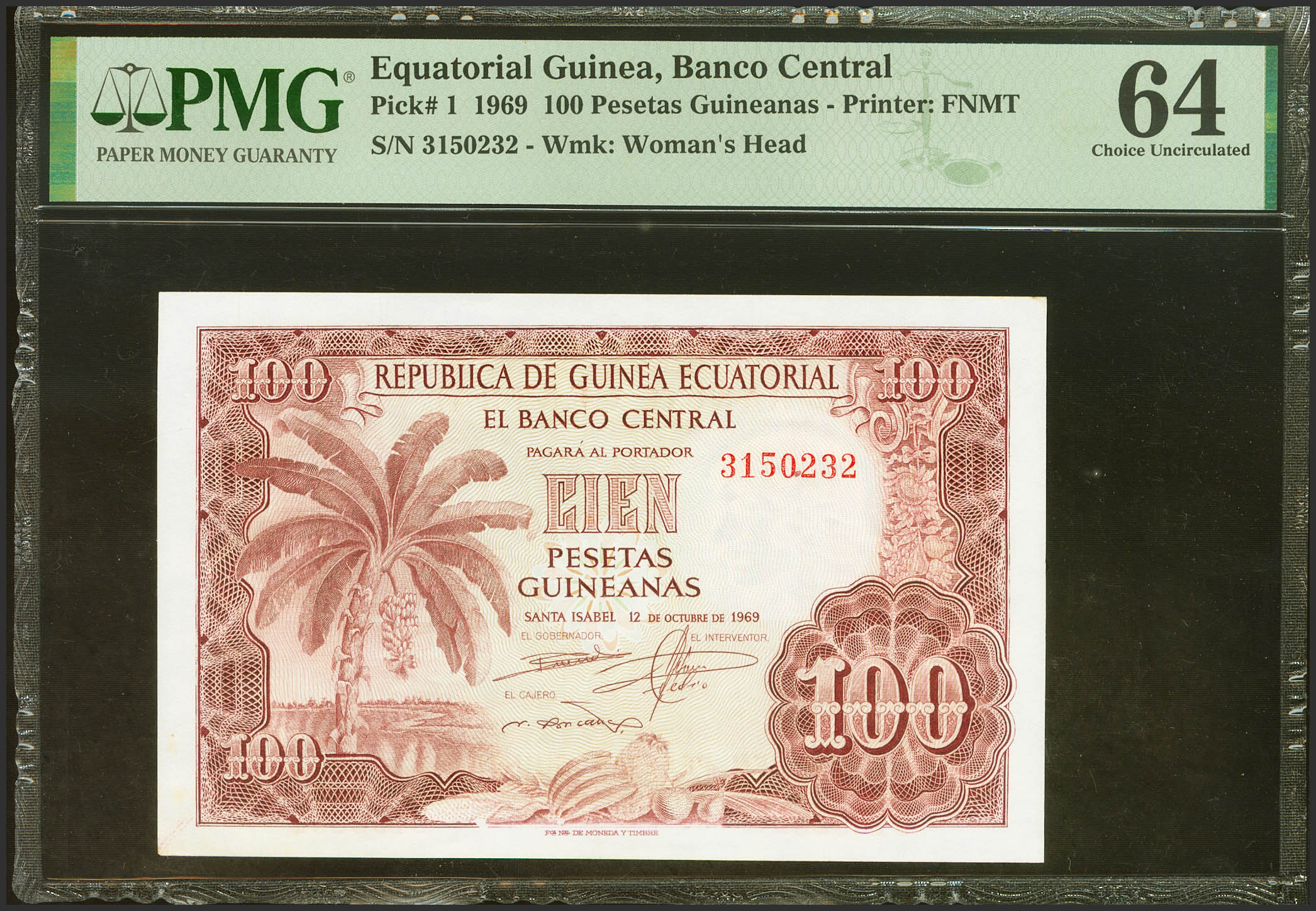 English EQUATORIAL GUINEA. 100 Pesetas. October 12, 1969. No series. (Pick: 1). Unusual. Uncirculated. PMG64 encapsulation.