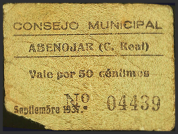ABENEJAR (CIUDAD REAL). 50 Cents. September 1937. (González: 27). Very rare, to give us an idea of the rarity of this bill in the González catalog it is not photographed. Fine.