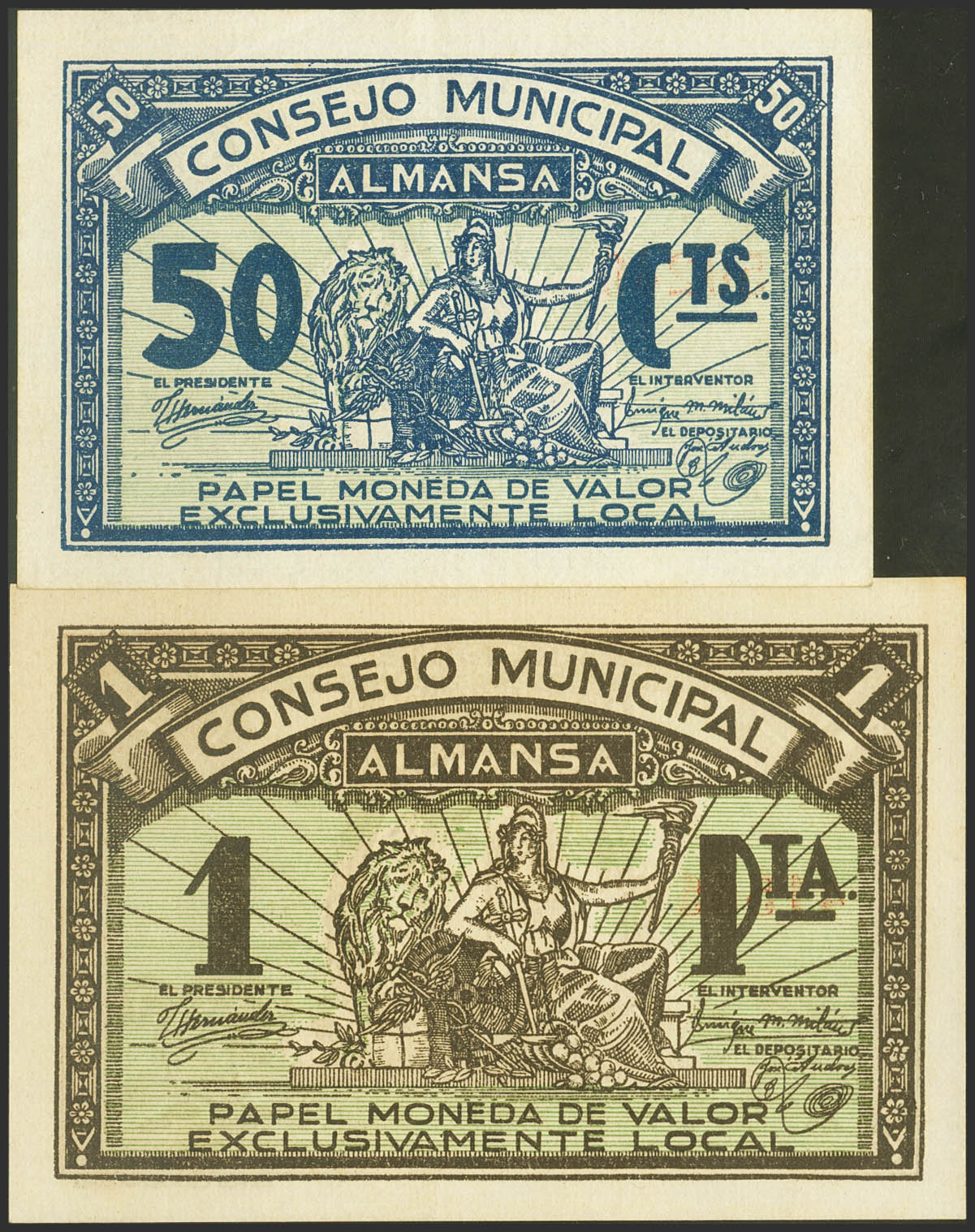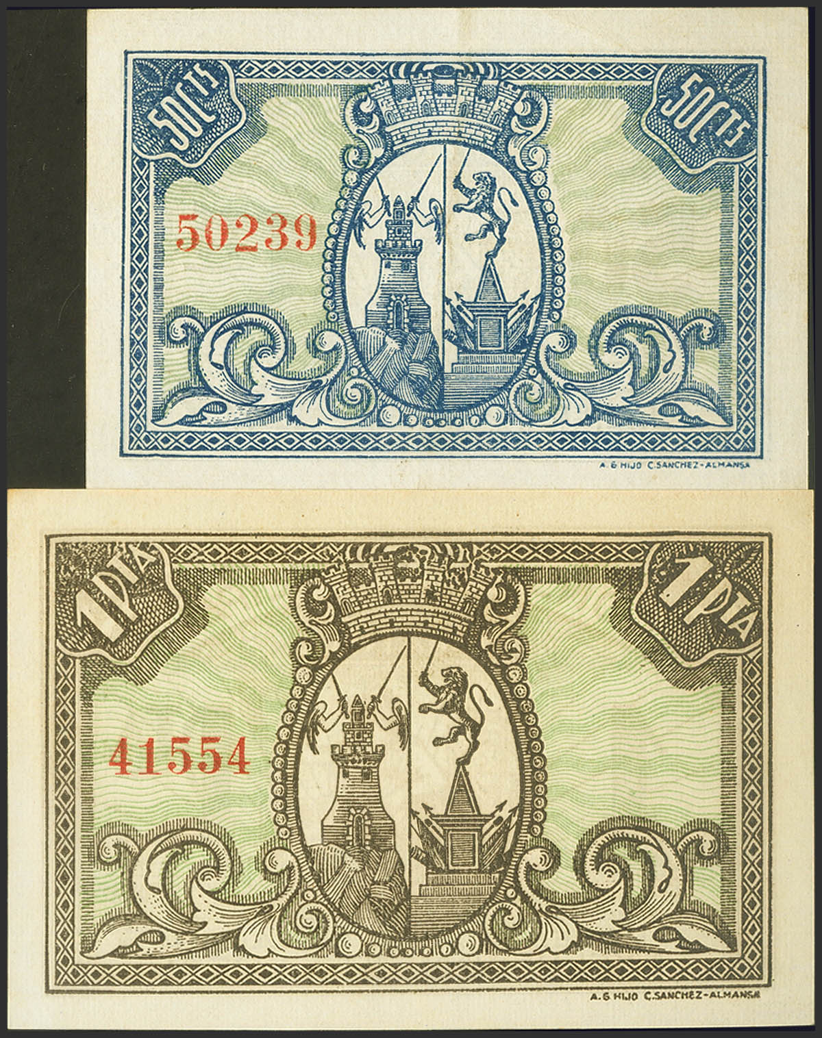 English ALMANSA (ALBACETE). 50 Cents and 1 Peseta. (1937ca). (González: 549/50). Complete series. Good Very Fine/Uncirculated-.