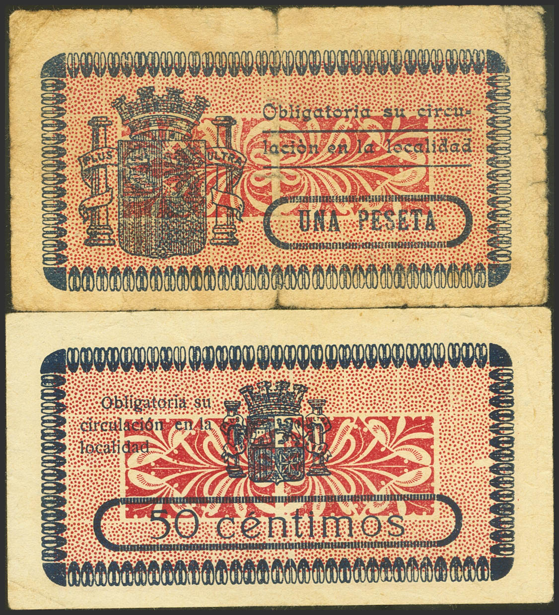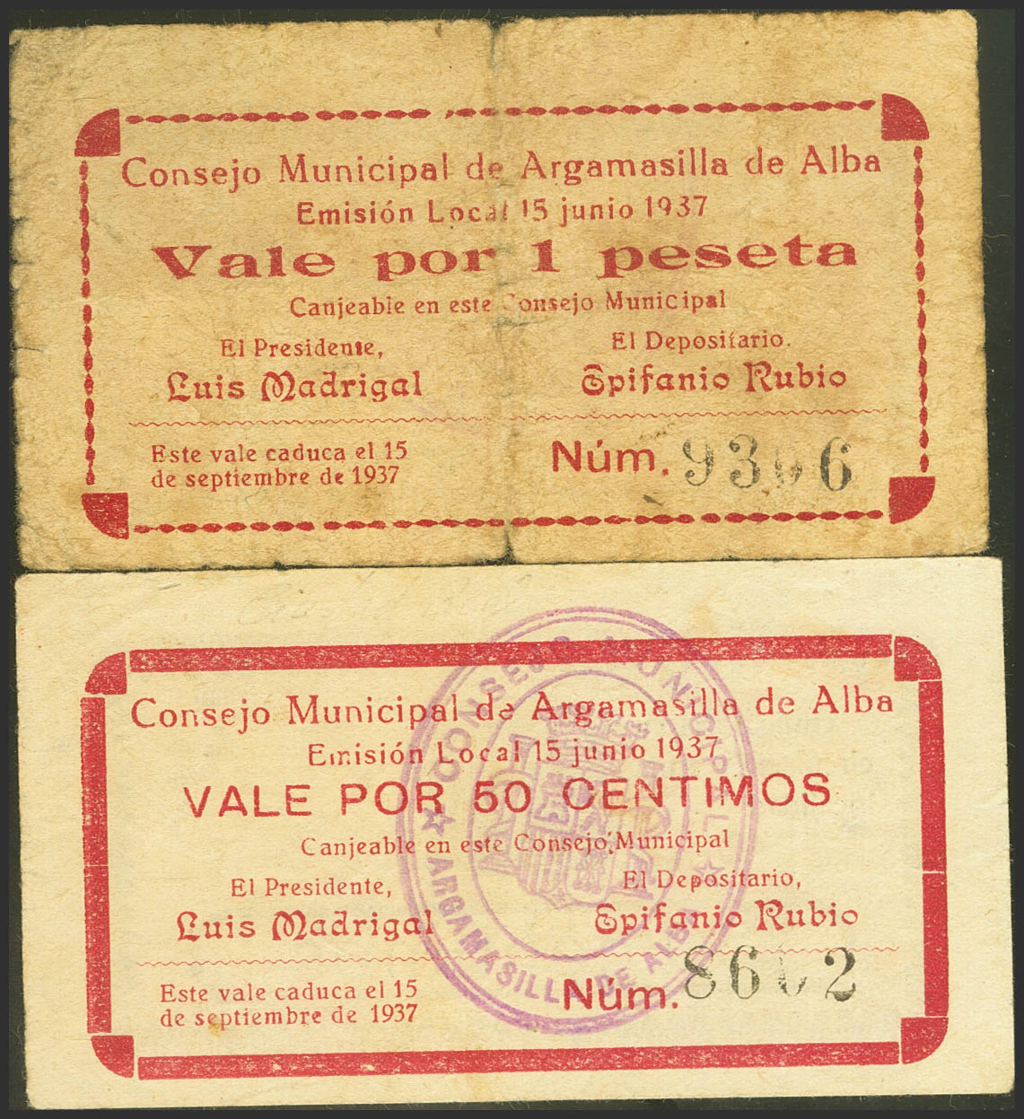 English ARGAMASILLA DE ALBA (CIUDAD REAL). 50 Cents and 1 Peseta. June 15, 1937. (González: 766, 768). Rare. Fine/Good Very Fine.