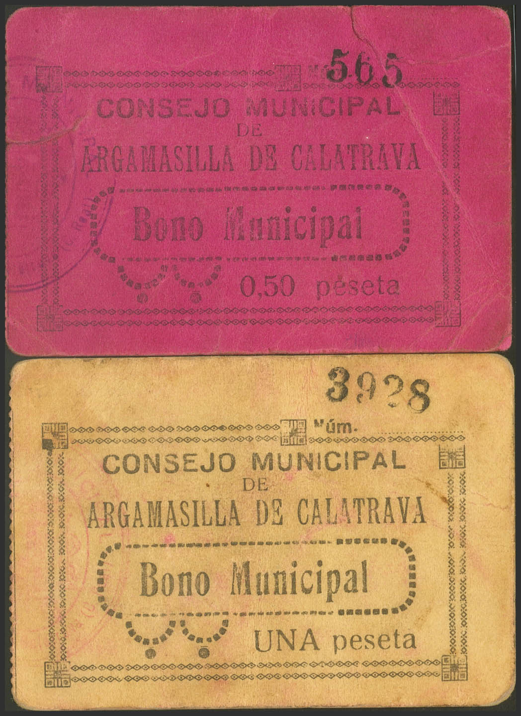 English ARGAMASILLA DE CALATRAVA (CIUDAD REAL). 50 Cents and 1 Peseta. (1937ca). (González: 772/73). Very rare complete series. Very Fine-.