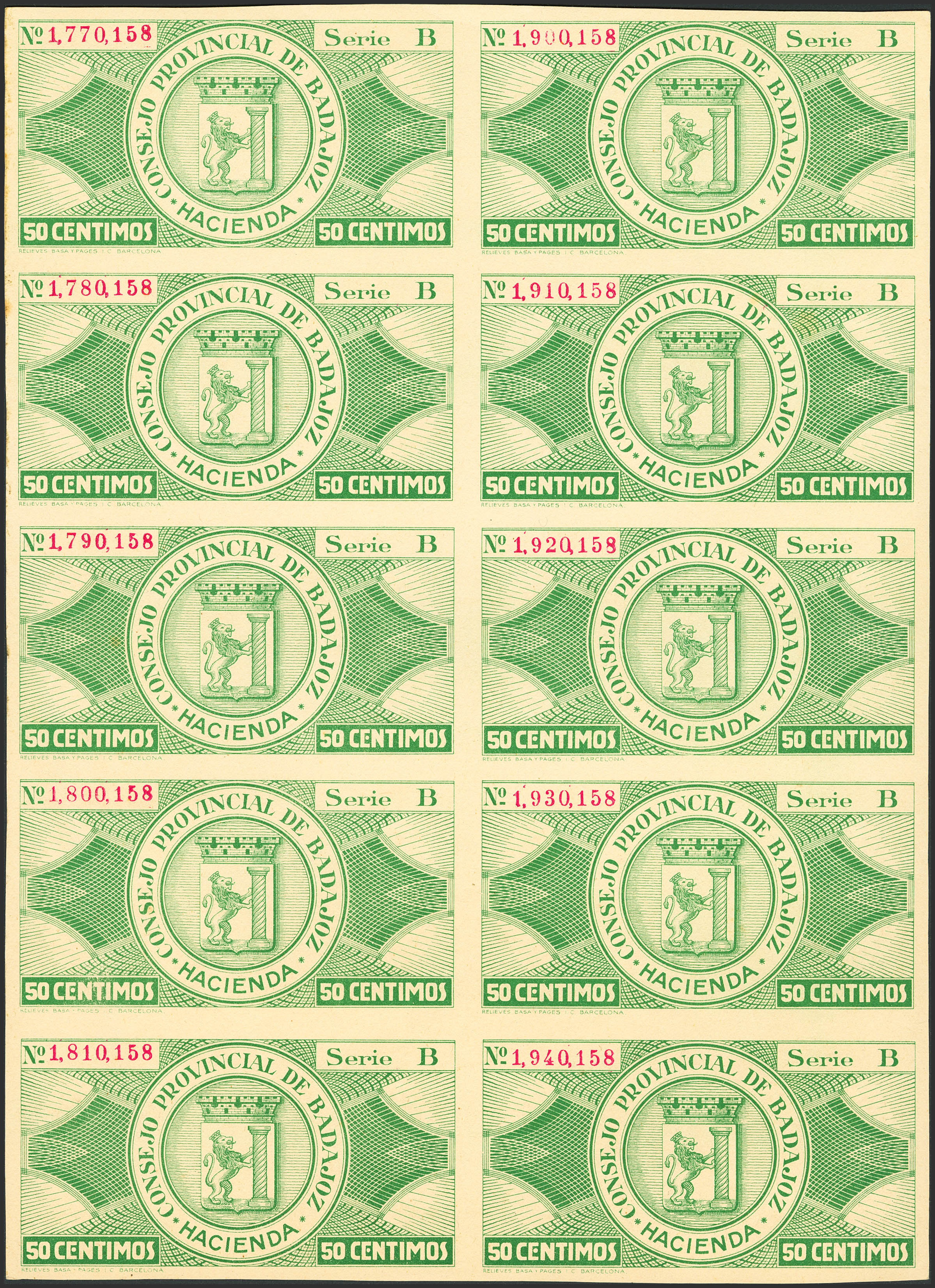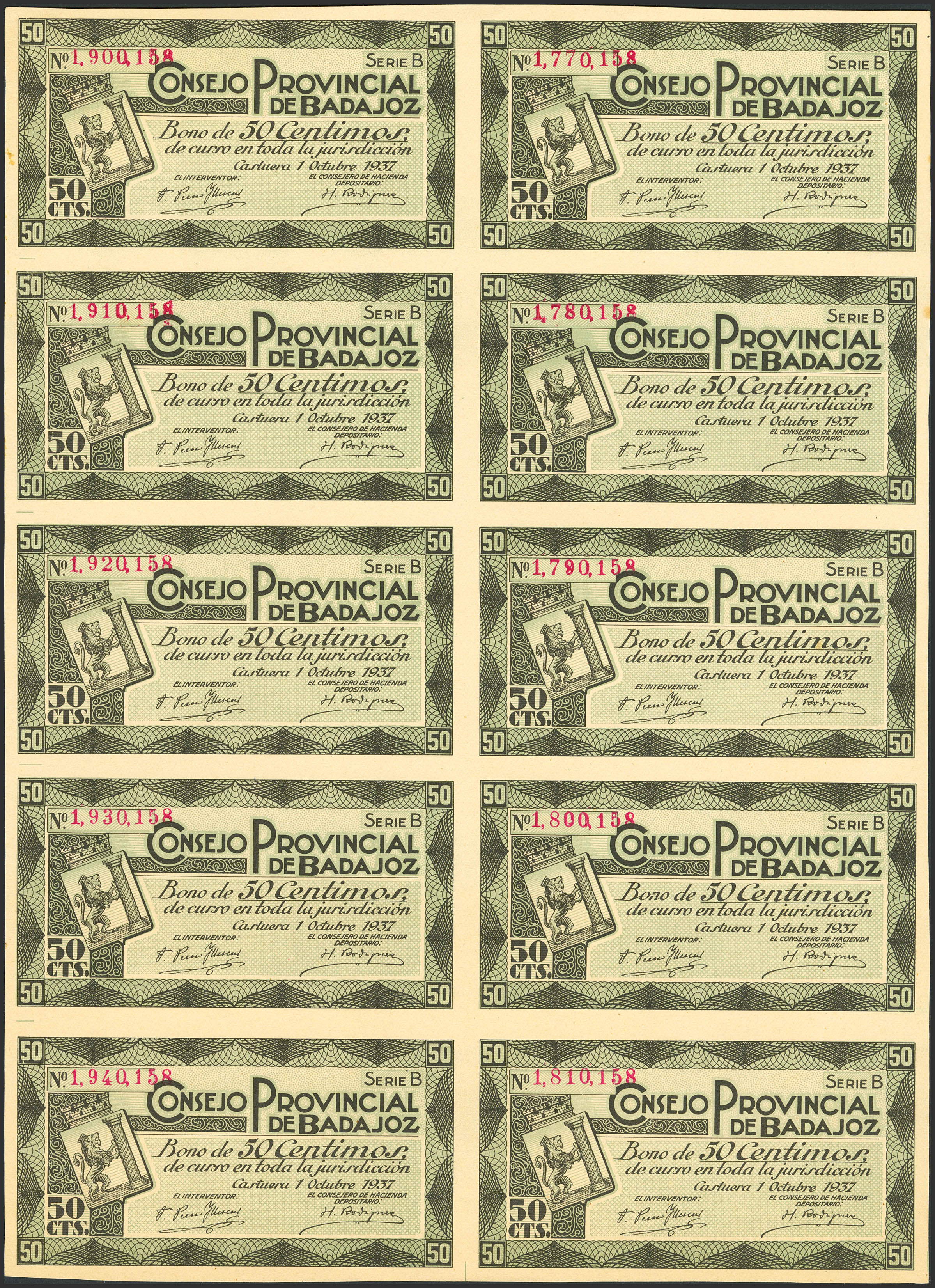 BADAJOZ. 50 Cents. 10 unguillotined bills. October 1, 1937. Series B. (González: 835). Uncirculated-.