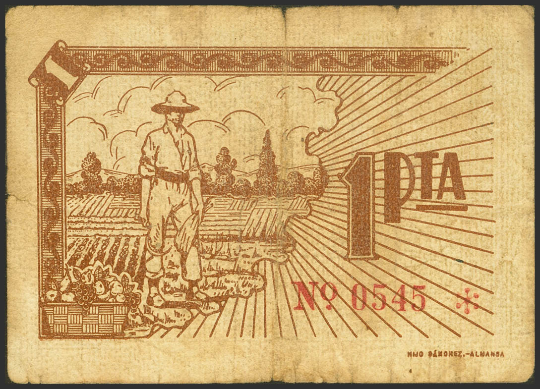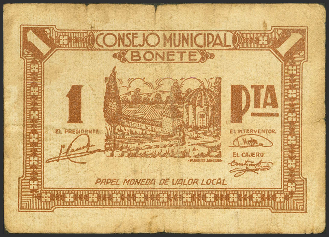 BONETE (ALBACETE). 1 Peseta. (1937ca). (González: 1279). Queer. Very Fine-.