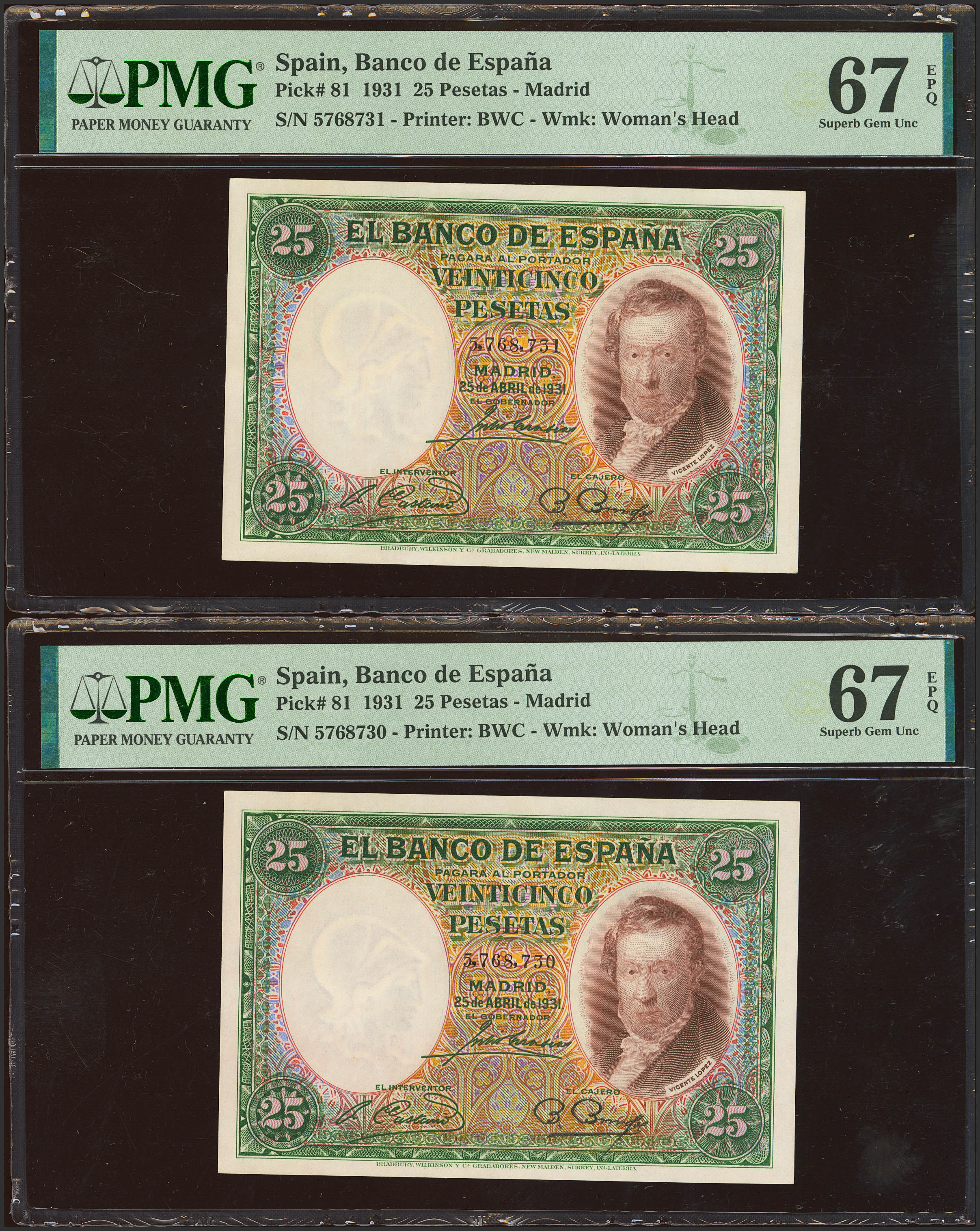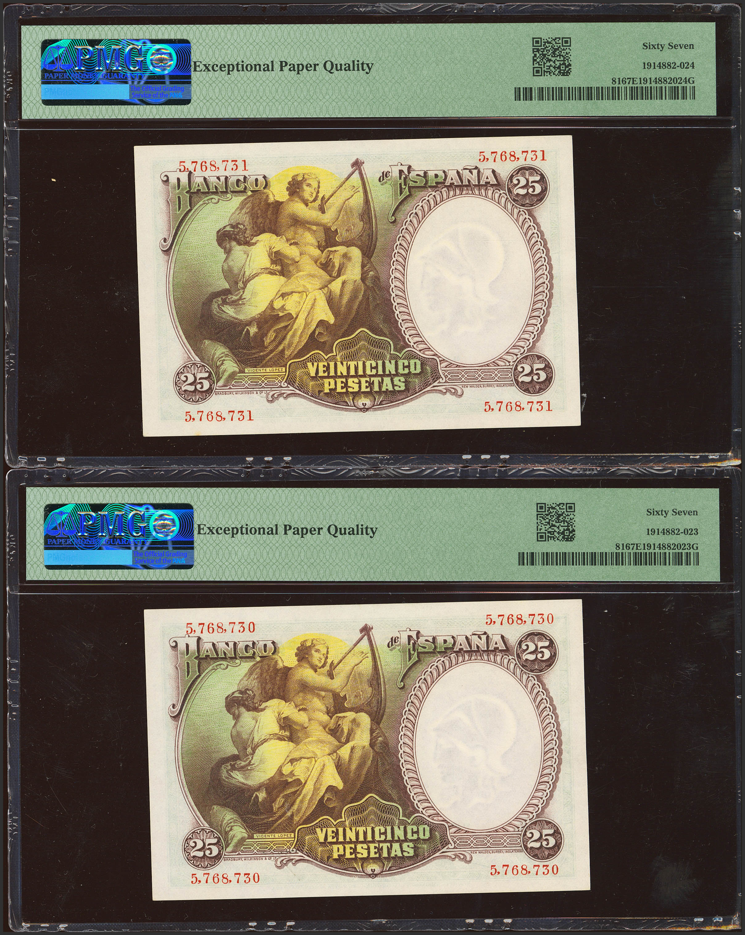 English 25 Pesetas. April 25, 1931. Correlative pair. No series. (Edifil 2023: 358, Pick: 81). Very rare in this exceptional quality, original finish. Uncirculated. Encapsulated PMG67EPQ.