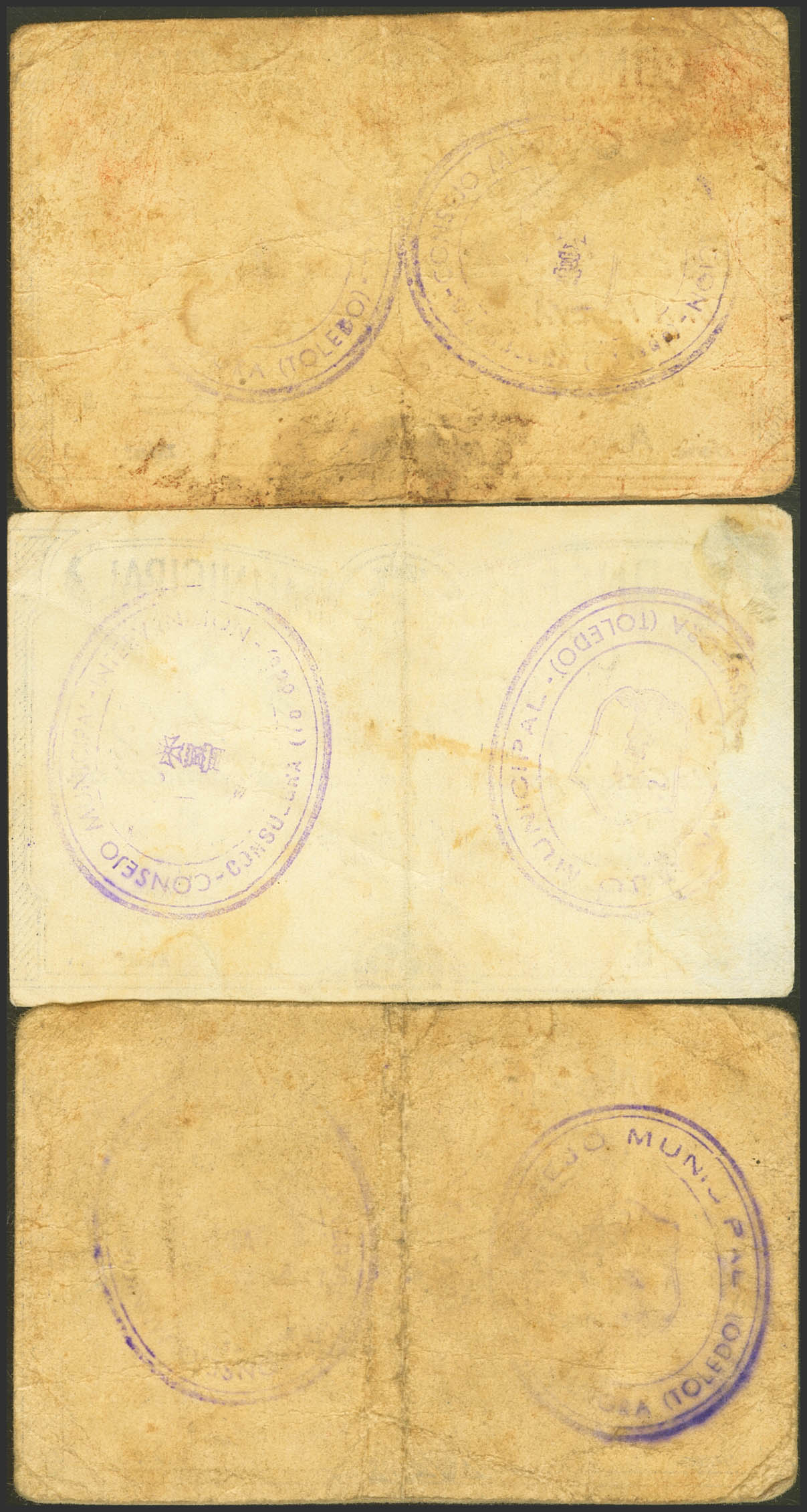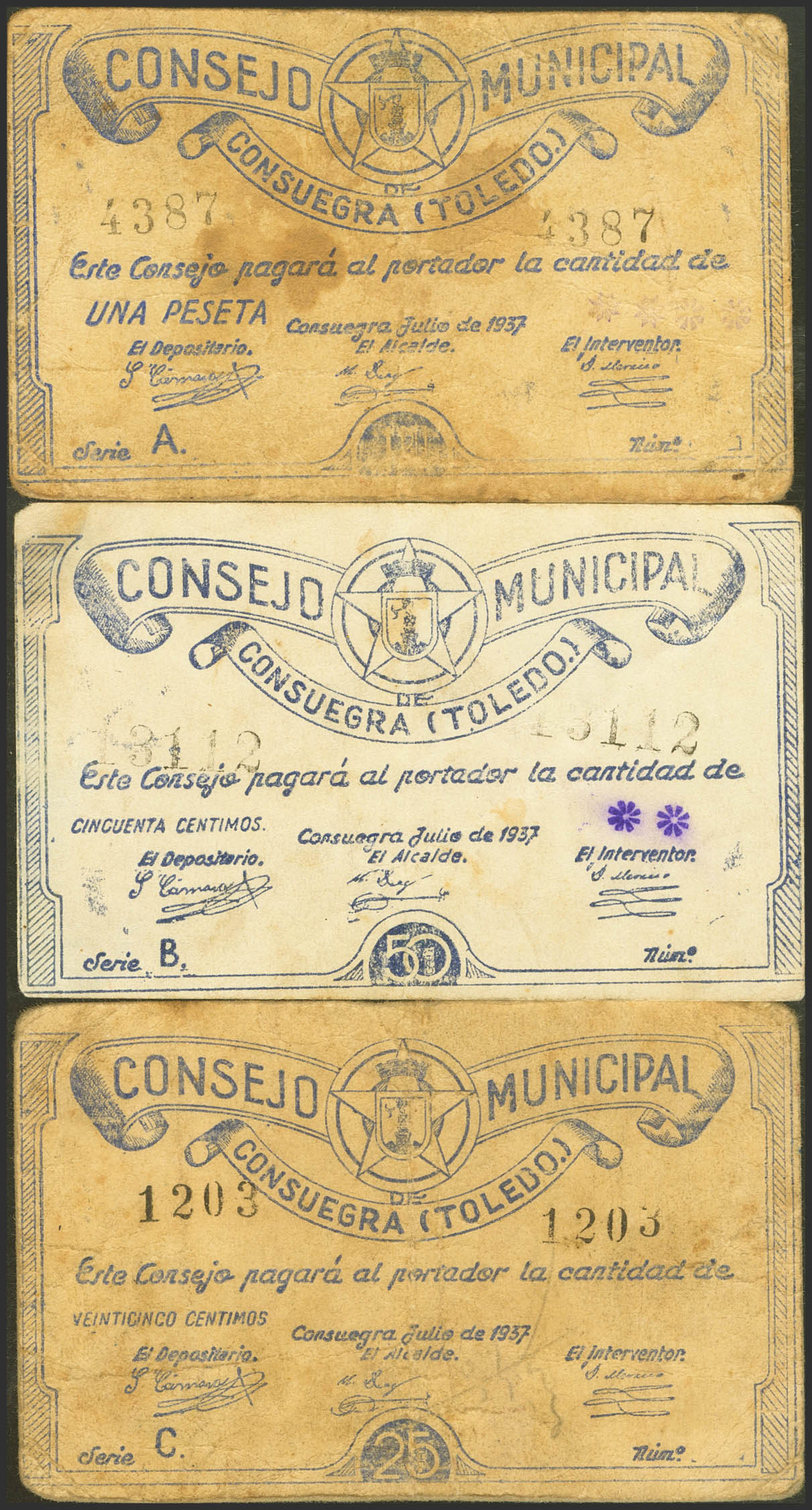 CONSUEGRA (TOLEDO). 25 Cents, 50 Cents and 1 peseta. July 1937. Series C, B and A, respectively. (González: 2031/33). Very rare complete series. Very Fine/Good Very Fine.