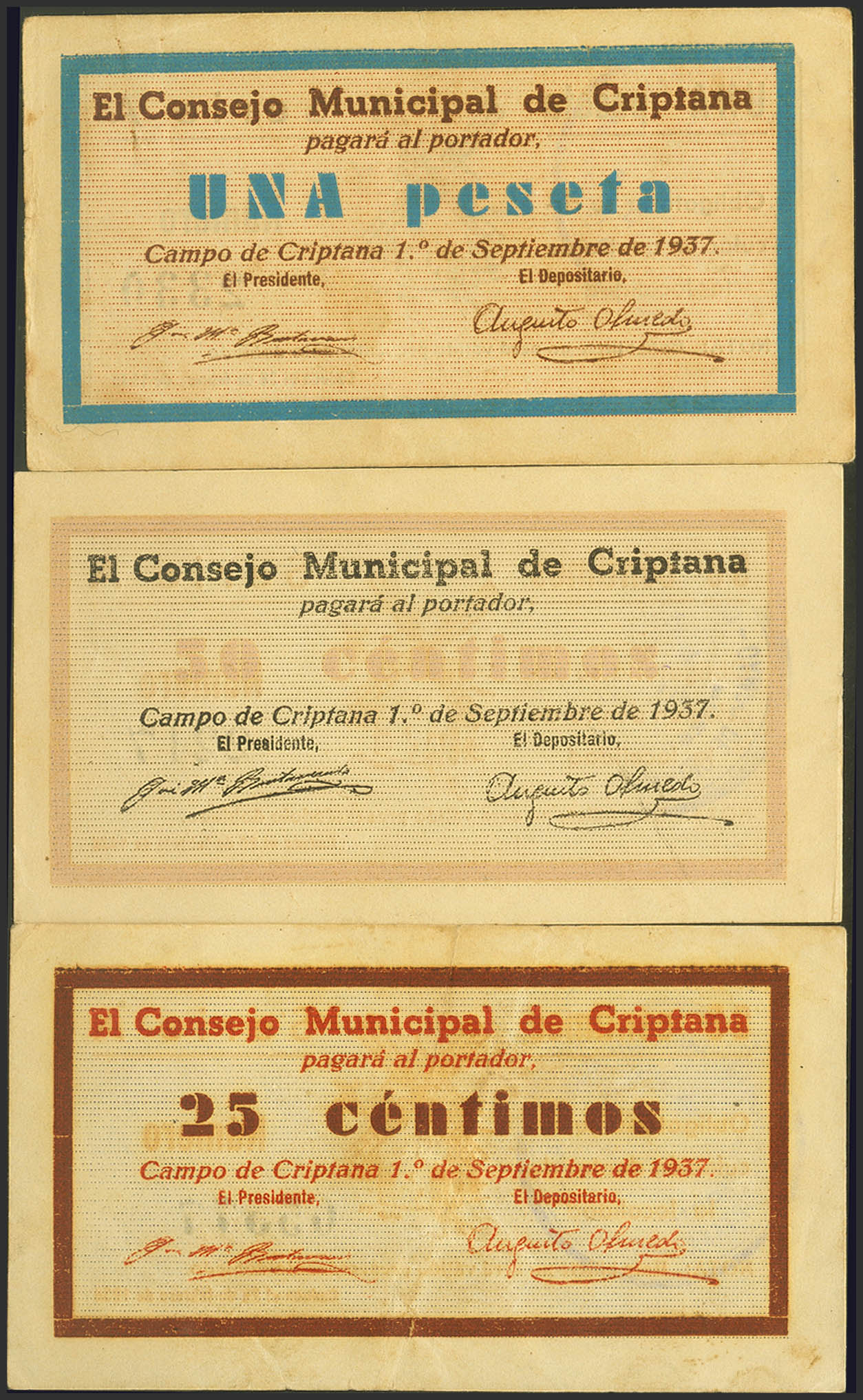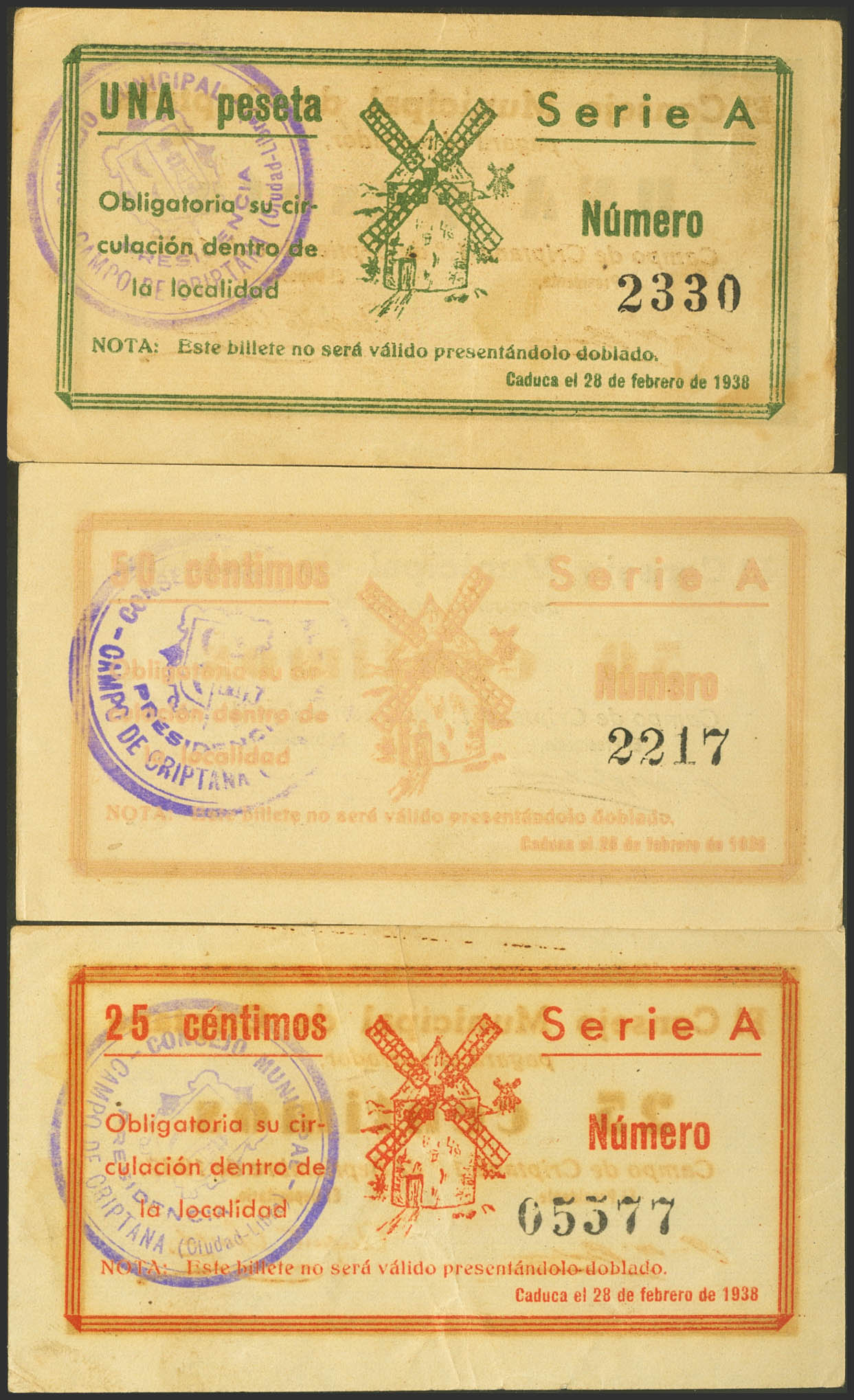 CRIPTANA (CIUDAD REAL). 25 Cents, 50 Cents and 1 Peseta. June 1, 1937. Series A. (González: 2096/98). Complete series. Good Very Fine/Good Extremely Fine+.