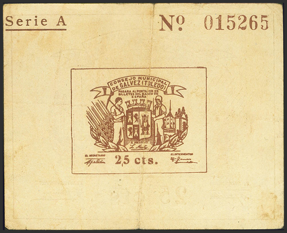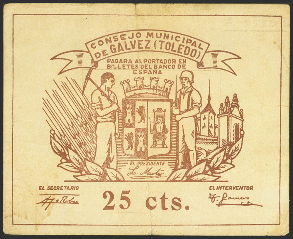 GALVEZ (TOLEDO). 25 Cents. (1937ca). Series A. (González: 2607). Very rare. VF+.