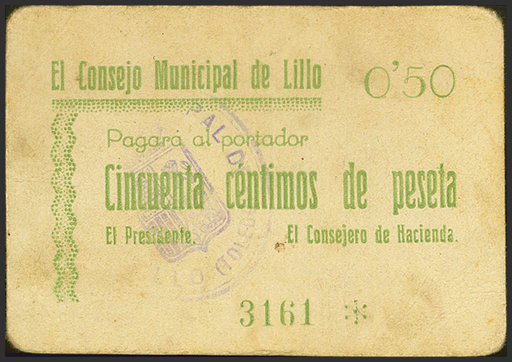 LILLO (TOLEDO). 50 Cents. (1937ca). (González: 3156). Rare, to give us an idea of its rarity in the González catalogue, this bill is not photographed. Good Extremely Fine++.