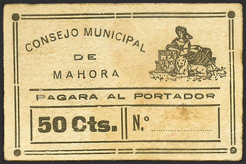 English MAHORA (ALBACETE). 50 Cents. (1937ca). (González: 3315). Very rare. Good Very Fine.