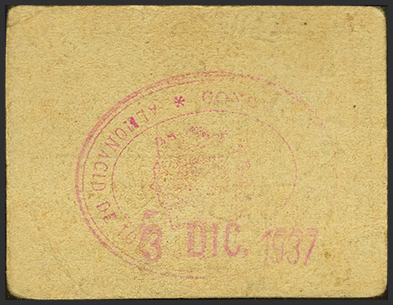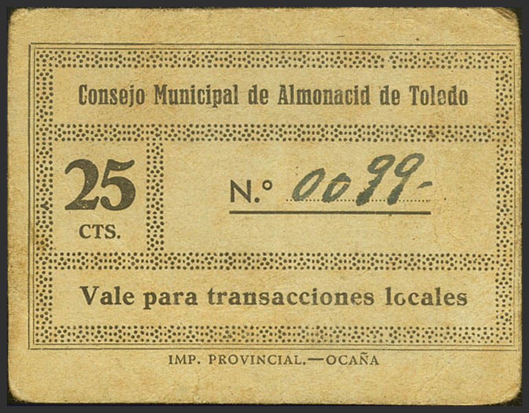 ALMONACID OF TOLEDO (TOLEDO). 25 Cents. December 3, 1937. (González: 604). Very rare. Good Very Fine.