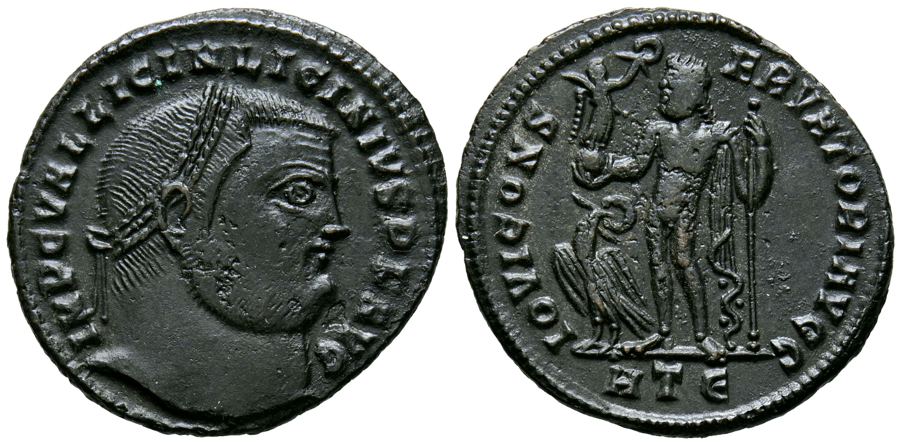 LICINIUS I. Follis. (Ae. 3.04g/22mm). 315-316 AD Heraclea. (RIC 13). Anv: Laureate bust of Licinius I to the right, around legend: IMP C VAL LICIN LICINIVS PF AVG. Rev: Jupiter standing on the left carrying Victory with a laurel wreath and scepter, at his feet eagle on the right with a laurel wreath, in exergue: HTЄ, around legend: IOVI CONSERVATORI AVGG. Extremely Fine-. Loose coinage.