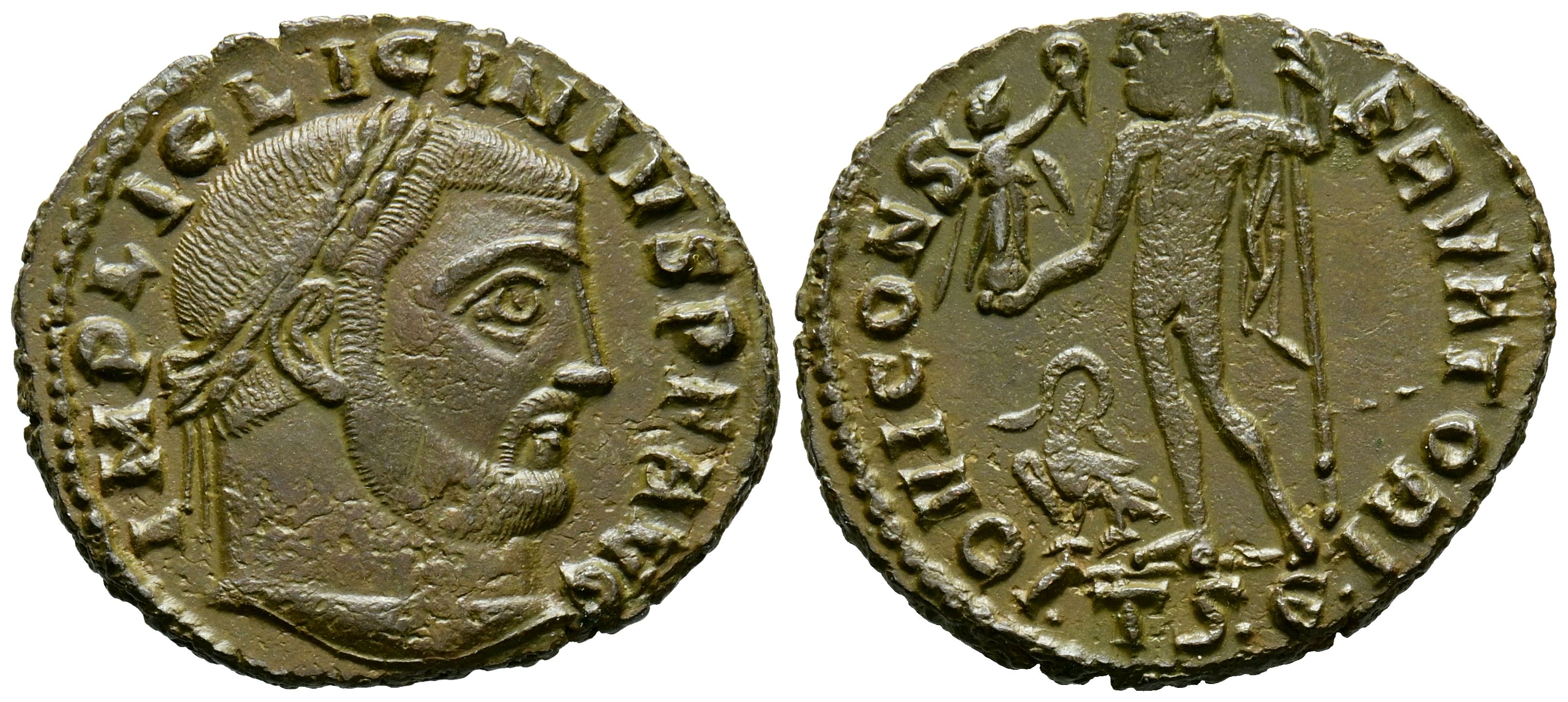 LICINIO I. Follis. (Ae. 3,28g/23mm). 312-313 d.C. Tesalónica. (RIC 60 var). Anv: Cabeza laureada de Licinio I a derecha, alrededor leyenda: IMP LIC LICINIVS P F AVG. Rev: Júpiter estante a izquierda portando Victoria con corona de laurel y cetro, a sus pies águila con corona de laurel, en exergo: TSЄ, alrededor leyenda: IOVI CONSERVATORI. EBC. Acuñación floja.