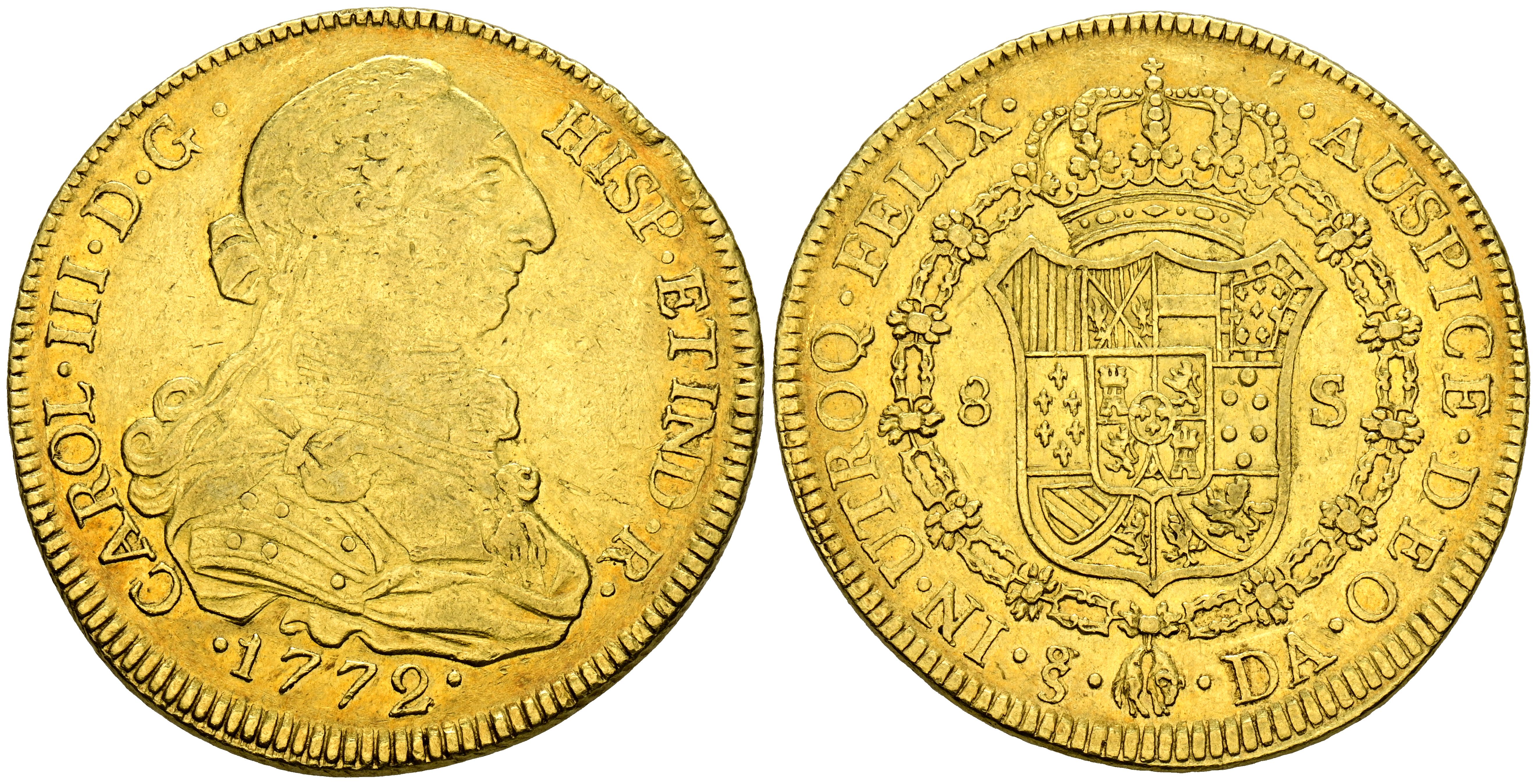 CHARLES III (1759-1788). 8 Escudos. (Au. 26.98g/37mm). 1772. Santiago DA. (Cal-2019-2146). First year of own bust. VF/VF+.