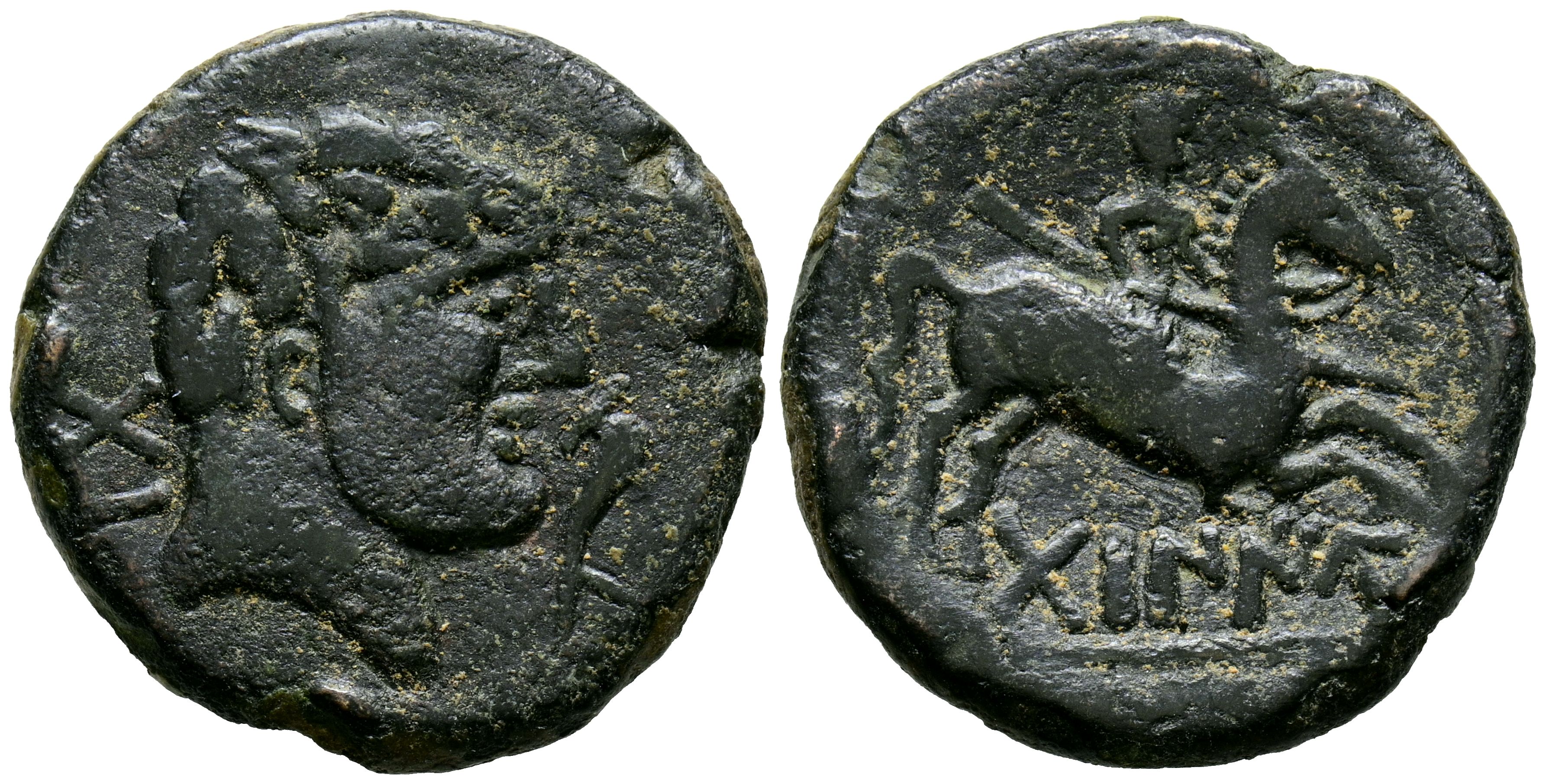 DABANIU (Débanos, Soria). As. (Ae. 10.08g/25mm). 120-20 Fine (FAB-884). Anv: Male head to the right, in front a dolphin and behind Iberian letters Da Ba. Rev: Horseman with lance to the right, below Iberian legend: DaBaNIU. VF-. Scarce.
