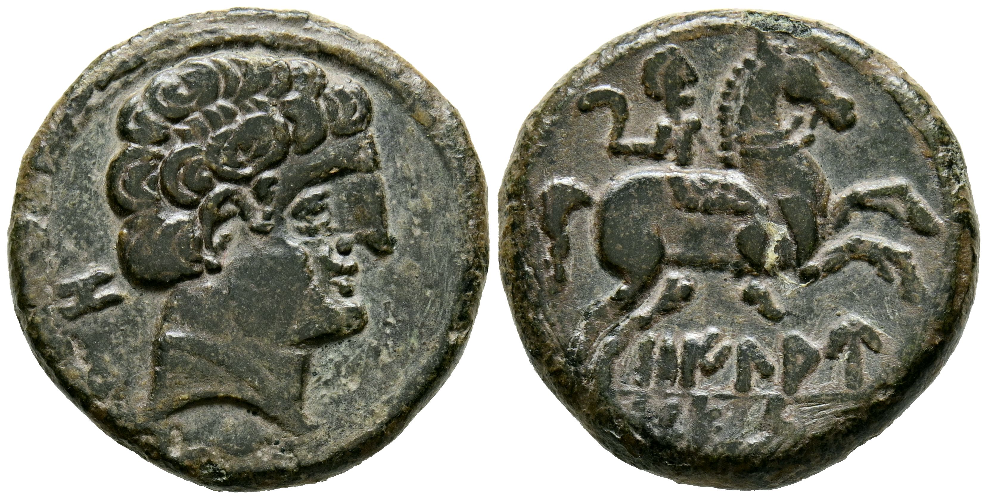OILAUNES (Northern Ebro area). As. (Ae. 8.86g/23mm). 120-20 Fine (FAB-1868). Obv: Male head to the right, behind Iberian letter: O. Rev: Rider with hook to the right, below Iberian legend between lines: OIAU/NES. VF+. Nice specimen, scarce as it is. Ex Aureo & Calicó, Auction 419 (10/19/2016), Lot No. 1102.
