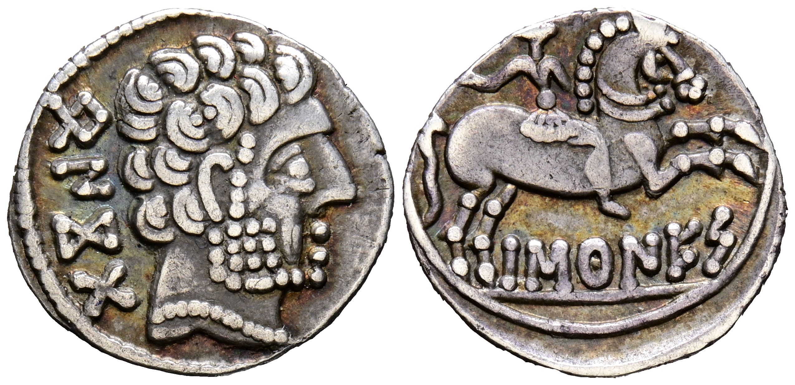 BASCUNES (Pamplona). Denarius. (Ar. 3.68g/17mm). 120-20 Fine (FAB-215). Obv: Bearded male head right, behind Iberian legend BeNCoDa. Reverse: Horseman with sword right, below Iberian legend BaSCuNES. VF+. Iridescent patina.