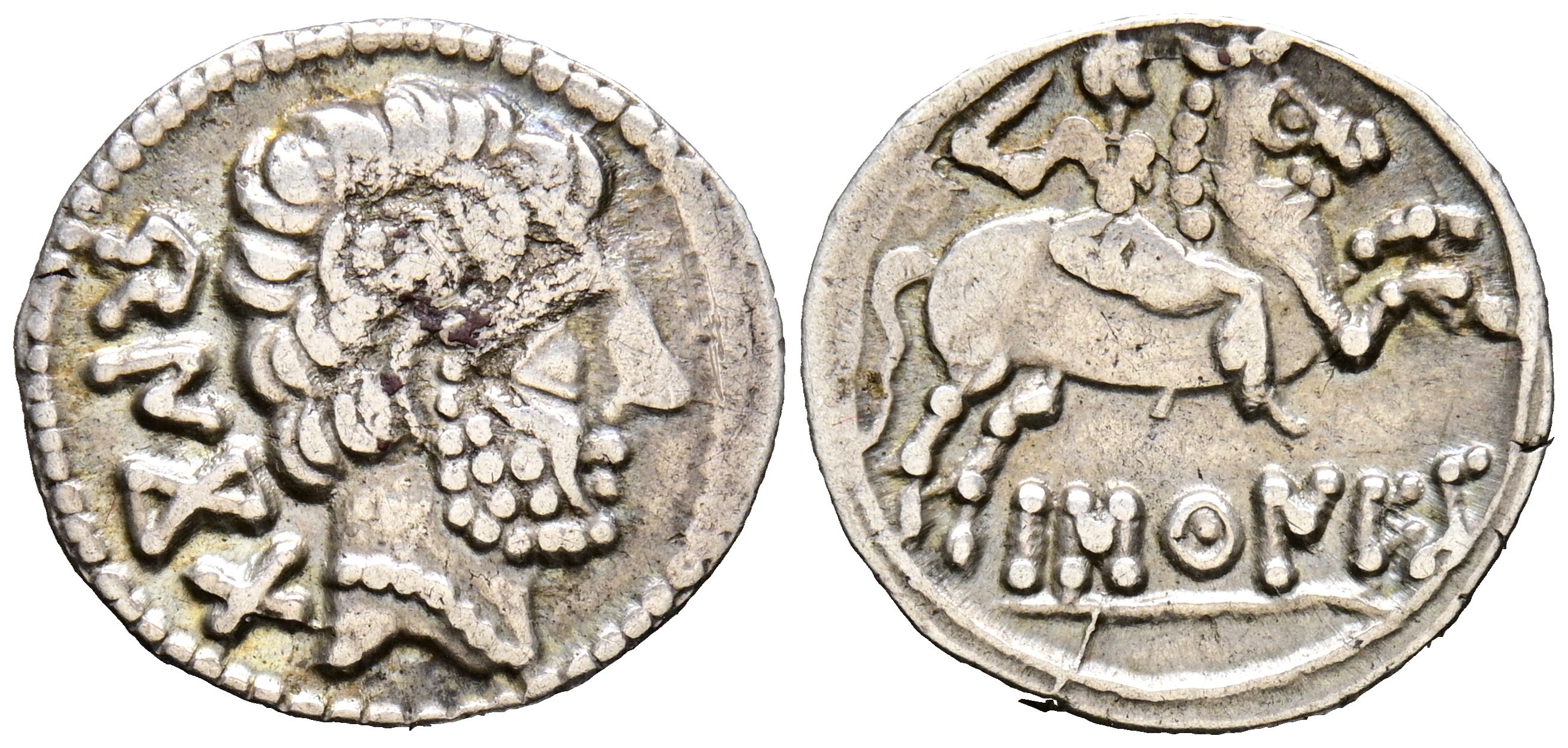 BASCUNES (Pamplona). Denarius. (Ar. 4.07g/18mm). 120-20 Fine (FAB-215). Obverse: Bearded male head to right, behind Iberian legend BeNCoDa. Reverse: Horseman with sword to right, below Iberian legend BaSCuNES. VF.