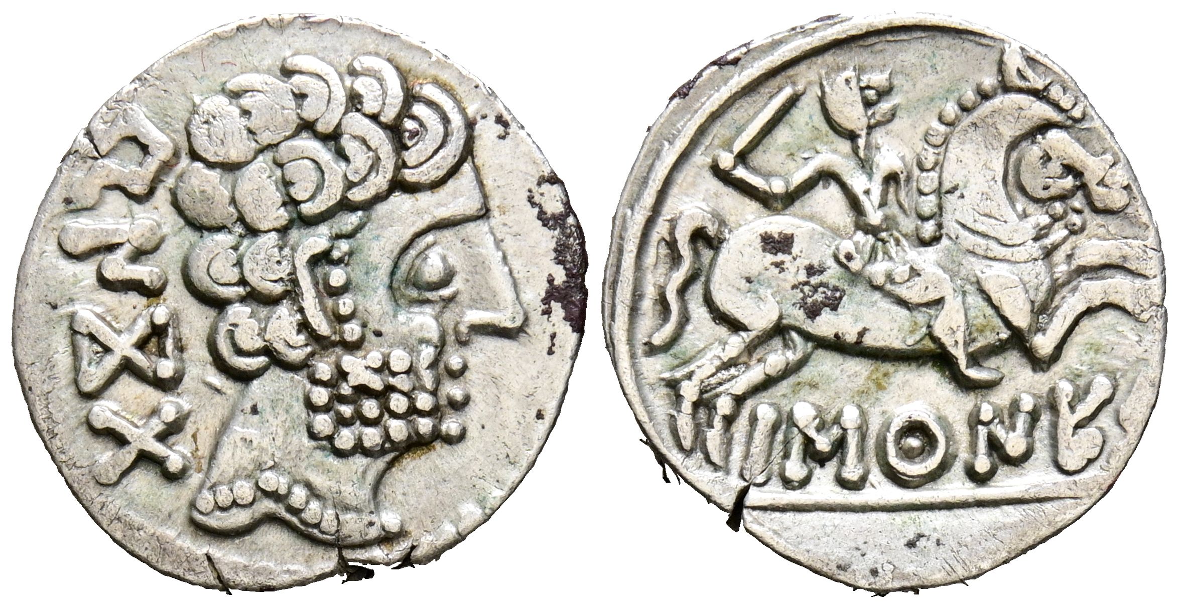 BASCUNES (Pamplona). Denarius. (Ar. 3.63g/17mm). 120-20 Fine (FAB-215). Obv: Bearded male head right, behind Iberian legend BeNCoDa. Reverse: Horseman with sword right, below Iberian legend BaSCuNES. VF+.