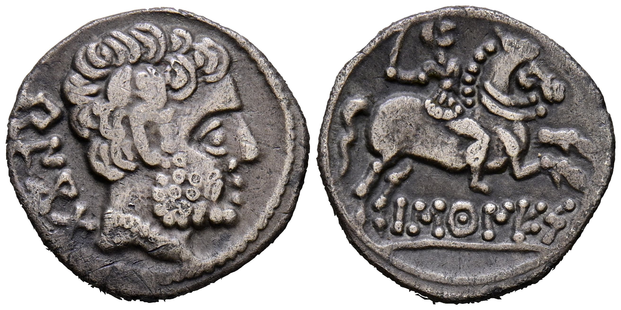 BASCUNES (Pamplona). Denarius. (Ar. 4.07g/18mm). 120-20 Fine (FAB-215). Obv: Bearded male head right, behind Iberian legend BeNCoDa. Reverse: Horseman with sword right, below Iberian legend BaSCuNES. VF-/VF.