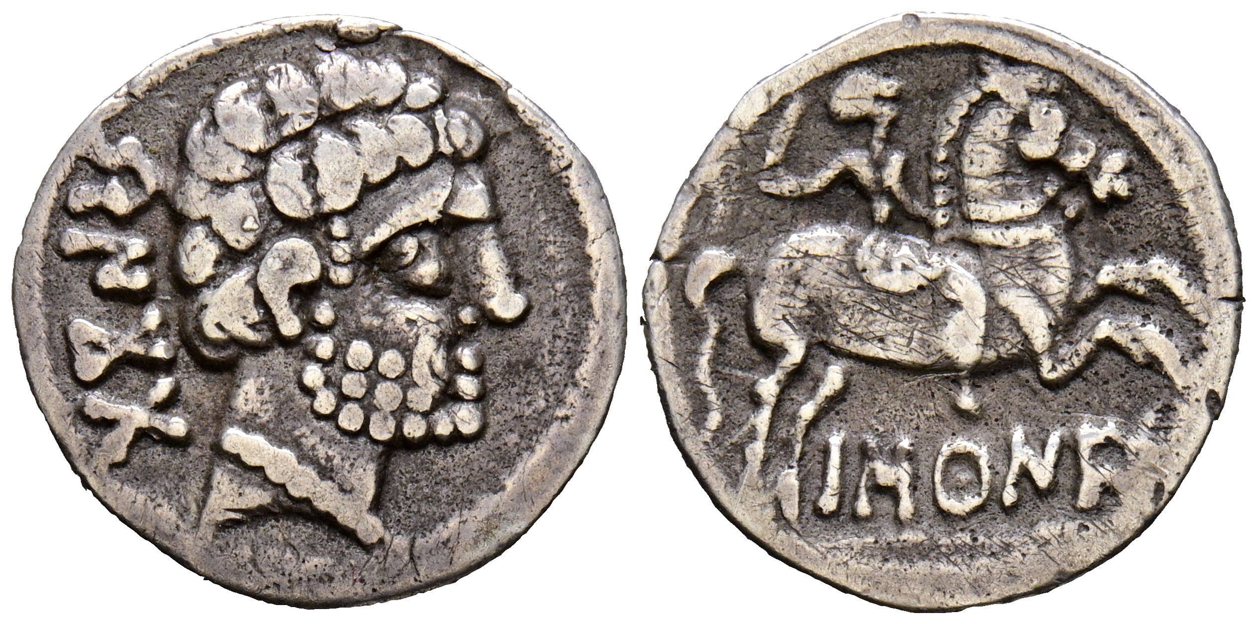 BASCUNES (Pamplona). Denarius. (Ar. 3.35g/18mm). 120-20 Fine (FAB-215). Obv: Bearded male head right, behind Iberian legend BeNCoDa. Reverse: Horseman with sword right, below Iberian legend BaSCuNES. VF.