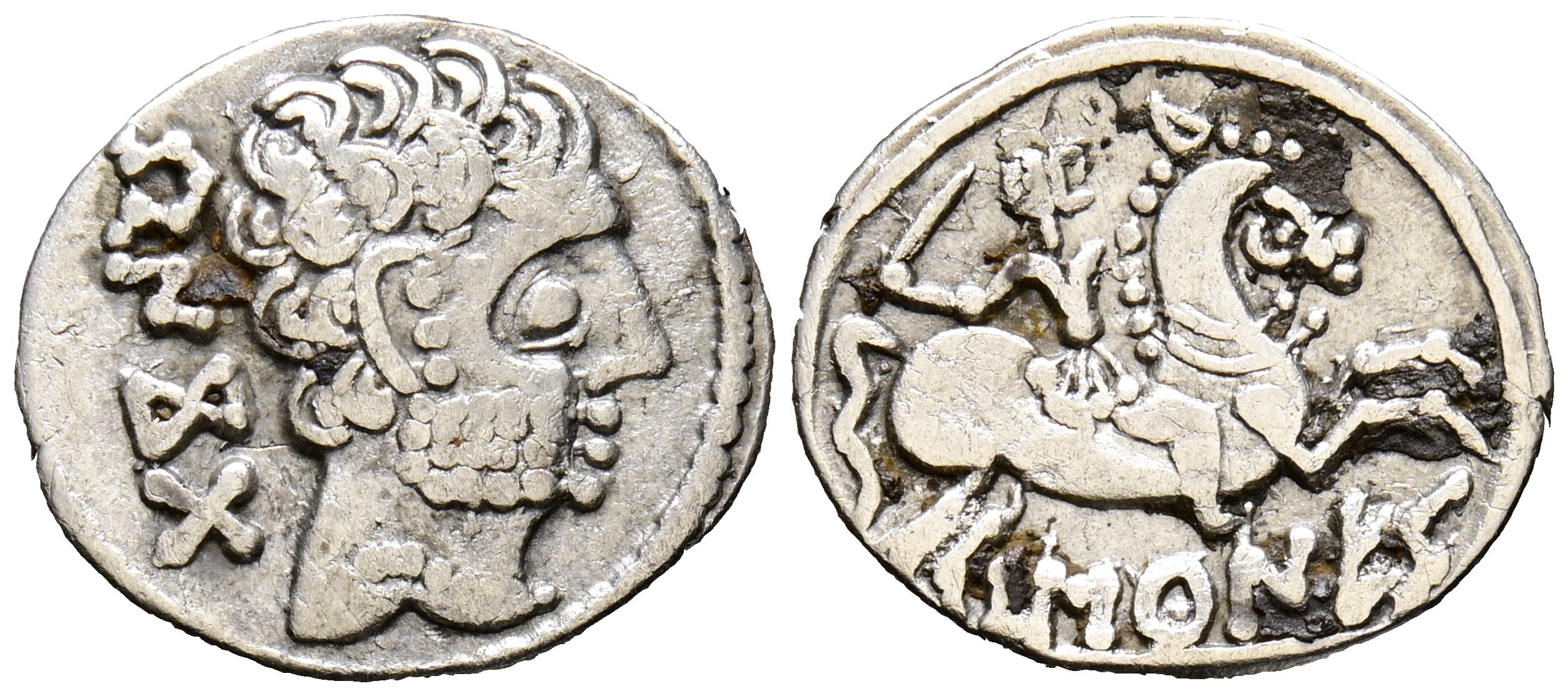 BASCUNES (Pamplona). Denarius. (Ar. 3.22g/18mm). 120-20 Fine (FAB-215). Obv: Bearded male head right, behind Iberian legend BeNCoDa. Reverse: Horseman with sword right, below Iberian legend BaSCuNES. VF.