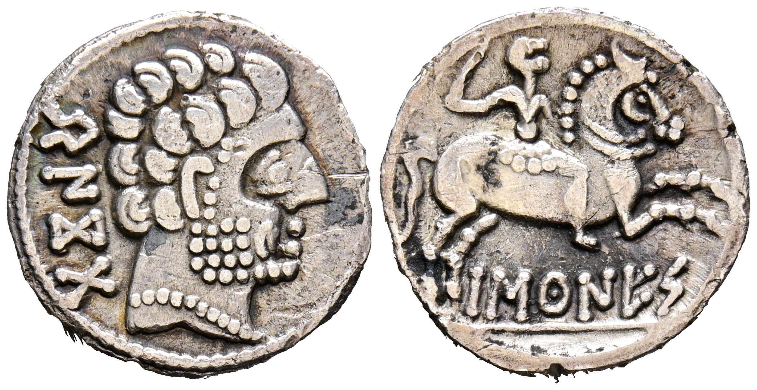 BASCUNES (Pamplona). Denarius. (Ar. 3.73g/18mm). 120-20 Fine (FAB-215). Obverse: Bearded male head to right, behind Iberian legend BeNCoDa. Reverse: Horseman with sword to right, below Iberian legend BaSCuNES. VF.