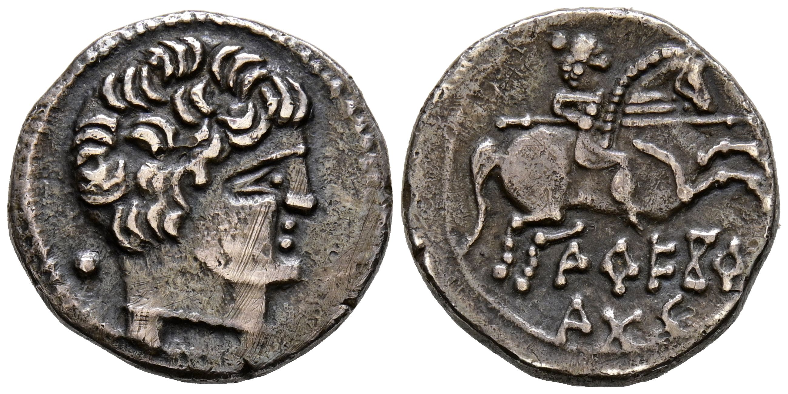 ARECORATAS (Agreda, Soria). Denarius. (Ar. 3.92g/18mm). 150-20 Fine (FAB-109). Anv: Male head to the right, behind Iberian legend: Cu. Rev: Horseman with lance to the right, below Iberian legend in two lines: ARECoR/ATaS. VF+.
